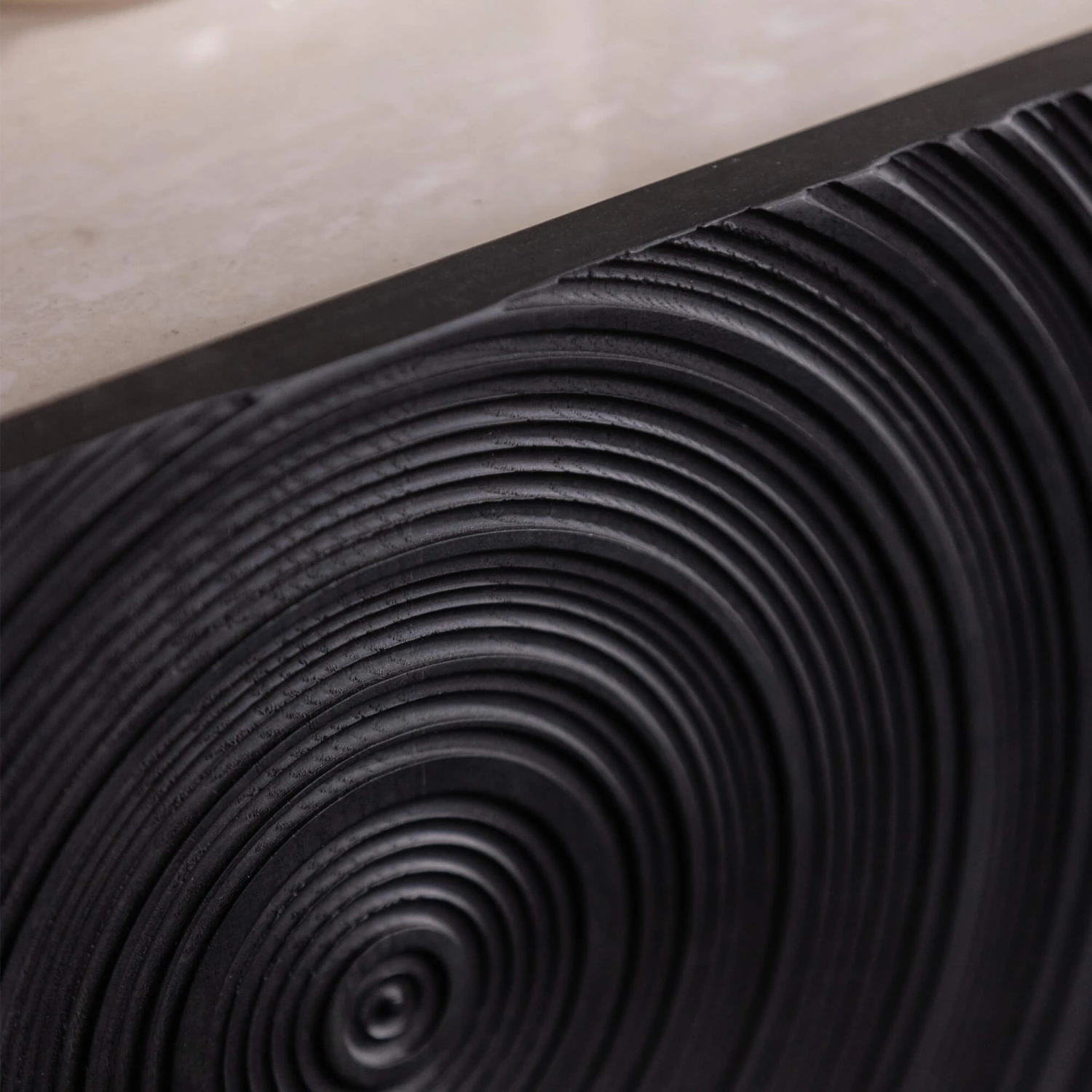 The Brann sideboard is a contemporary piece of luxury furniture that combines sophisticated design with natural textures, making it a perfect addition to any modern interior. It features a striking black textured front with a unique circular groove pattern, adding an artistic touch and a sense of depth. The sideboard’s design is further elevated by a light grey ceramic top that is slightly recessed and framed by a raised black lip. This detail creates a clean, defined aesthetic and beautifully contrasts with the bold texture of the doors. Resting on an elevated open base with bronze-coloured metal legs, the sideboard achieves a sleek, floating appearance that enhances its contemporary silhouette.
