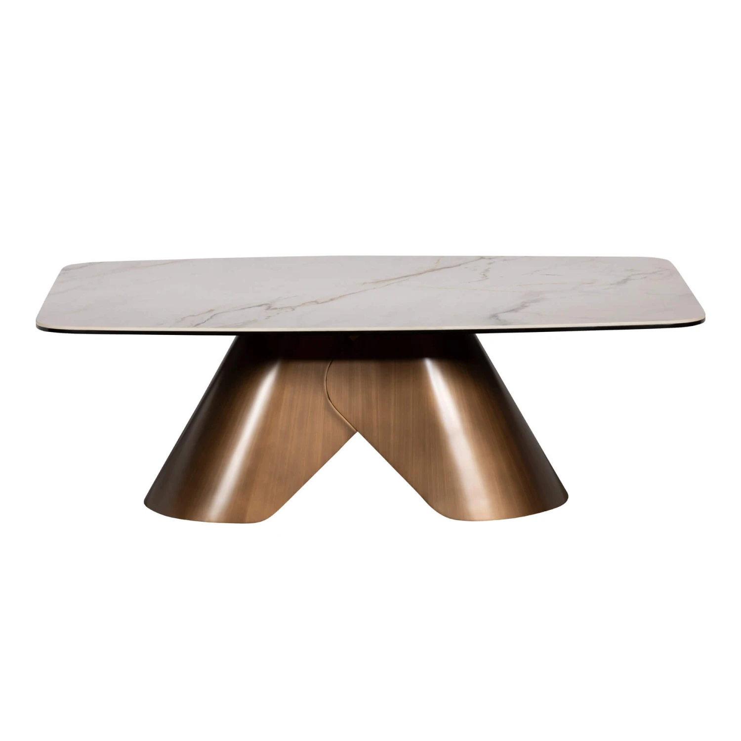 Beneath, the table’s architectural base makes a bold statement with overlapping, arching legs in a rich bronze-coloured finish. The twin flared supports form an open, sculptural shape, enhanced by a vertical brushed texture that catches the light beautifully. This distinctive design balances contemporary style with a sense of grounded elegance, making it an ideal centrepiece for any luxury living space seeking both visual intrigue and timeless appeal.