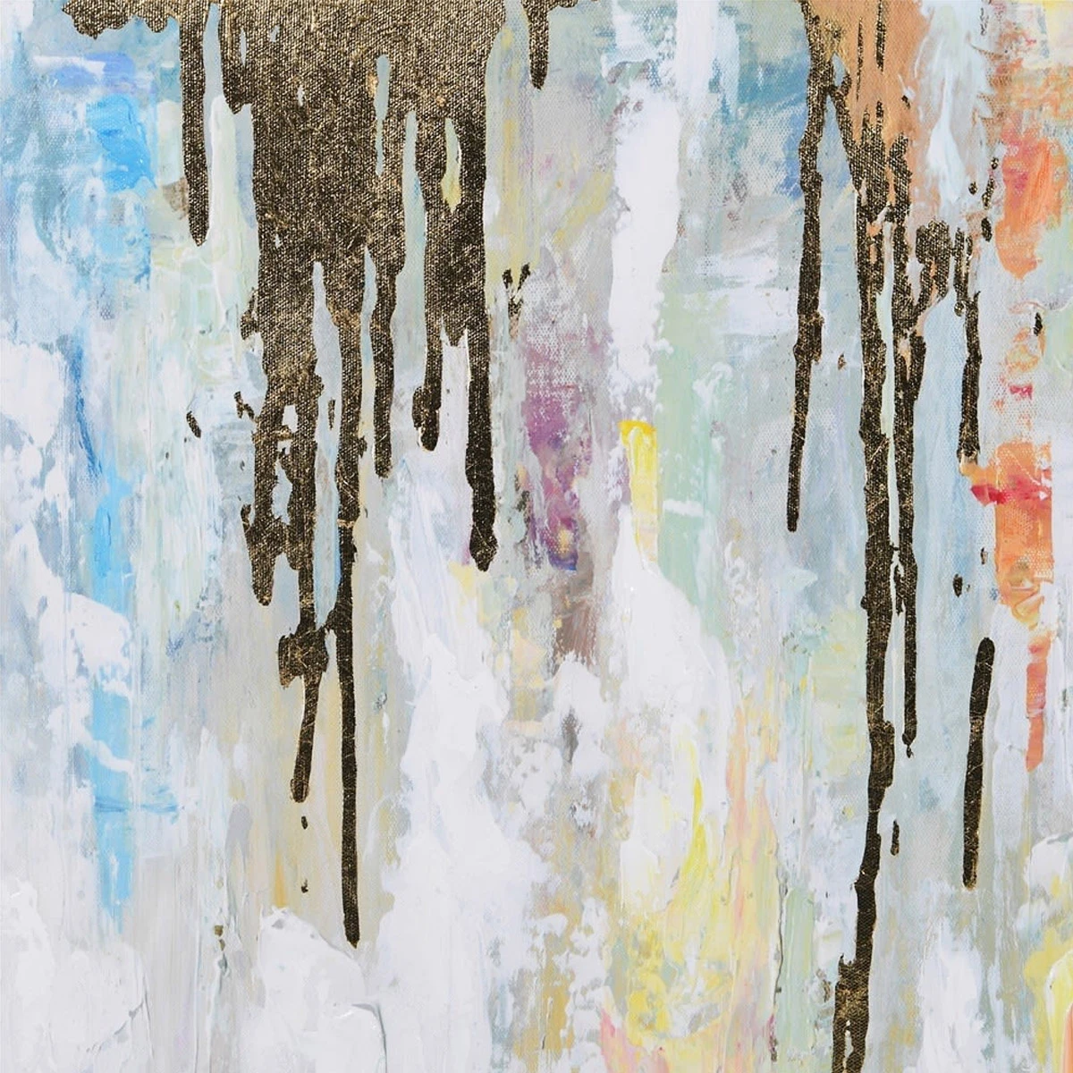 This abstract style painting on canvas is a stunning accent piece that brings sophistication to any interior. The soothing design in pale blue tones contrasts beautifully against the striking drips of metallic gold, which add texture and depth. Guaranteed to create a statement in any room, it is a truly timeless piece of art.