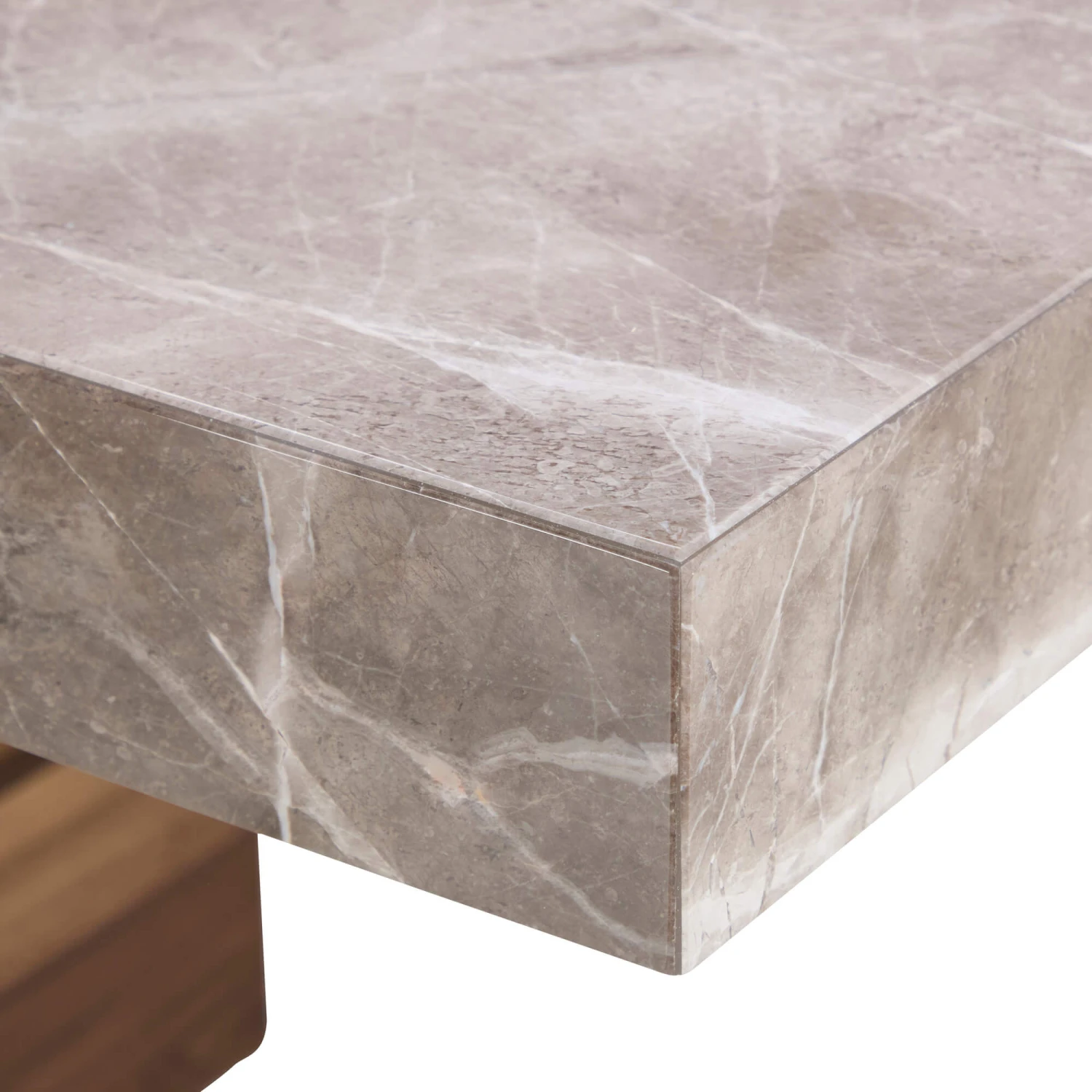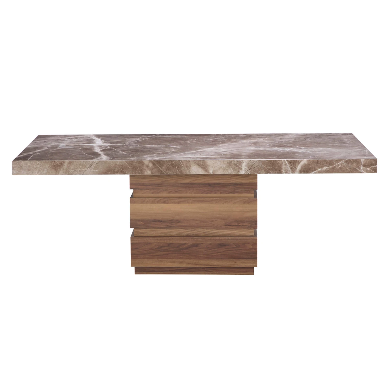 A podium dining table featuring a large wooden base that featured tiered, layered segments that wraps around the base adding depth, visual appeal along with a geometric presence. Paired with the base is a large, striking brown marble table top that has unique character with its natural veining throughout, with a blend of browns and whites, giving the table a warm look.