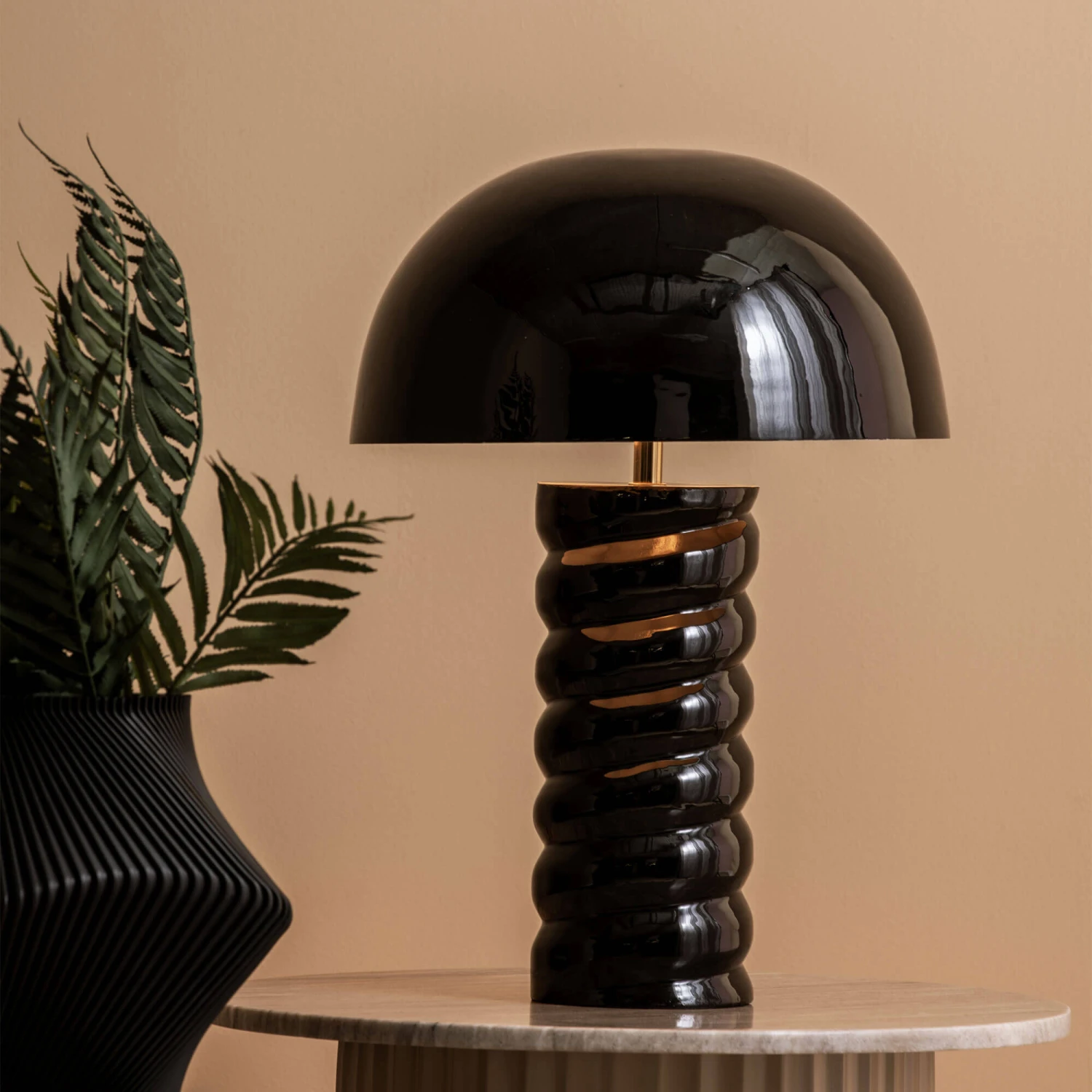 Introduce modern elegance with a playful twist to your living space with this Gracio Black Enamel Table Lamp. Illuminable by a required E27 bulb, this charming table lamp features a dome shaped shade with a striking curled base in a shiny black enamel finish, providing a warm and cosy ambience. Operated by an inline switch, it is convenient and easy to use. Available in various colours, this timeless table lamp will elevate any room and is perfect for adding a touch of luxurious style and sophistication able to fit effortlessly into any interior.