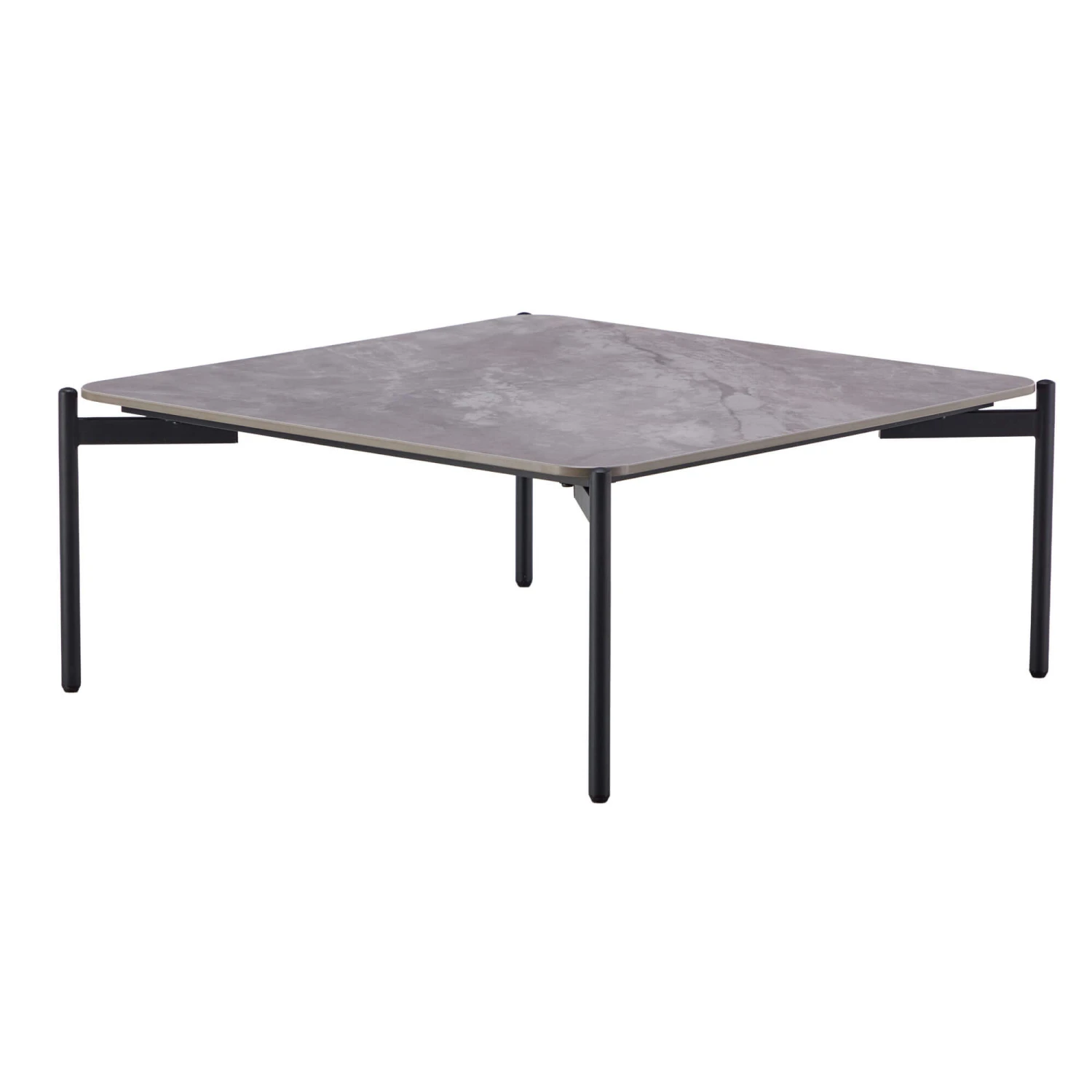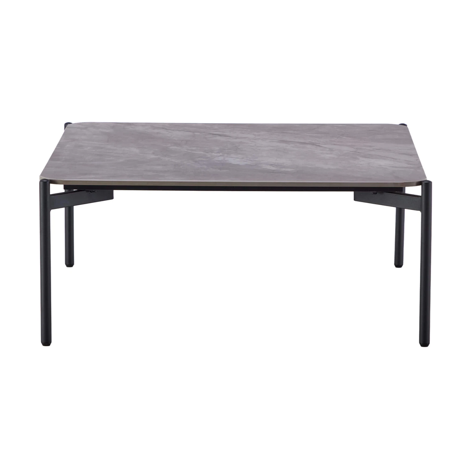 A Grey ceramic coffee table with a distinct marble effect top that is layered with a strong glass coating. The table has slender black powder-coated metal legs that exude out from the corner of the rounded table top creating additional depth and charm.