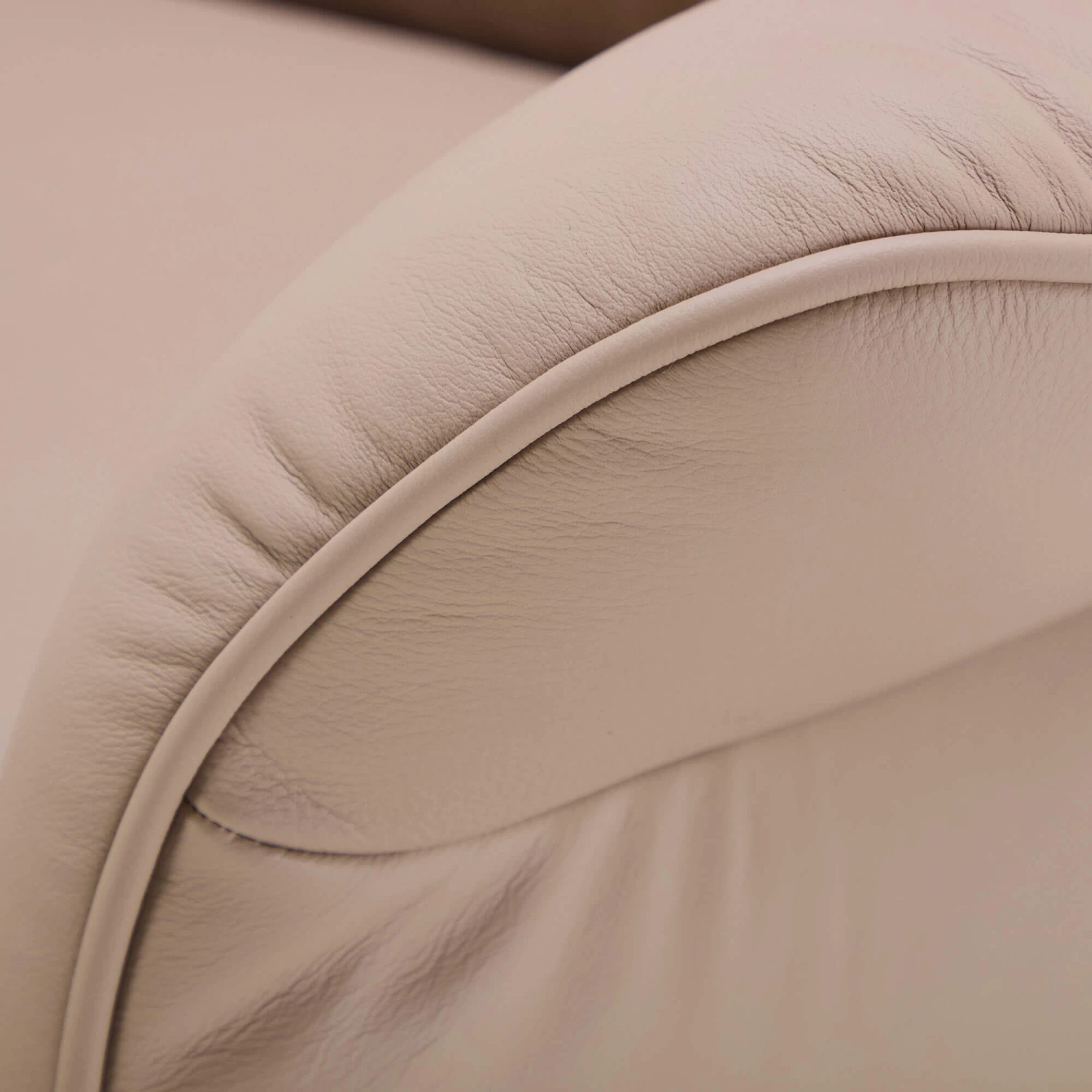 The Himolla Loona recliner is a luxurious chair designed for ultimate comfort and relaxation. Its tall back and generously proportioned seat, accented with elegant piped seams, provide unparalleled support. Sink into the cloud-like softness of the foam filling, as it cradles your body and melts away stress. The timeless design, highlighted by the distinctive piped seam and single tufted value, adds a touch of sophistication to the comforting recliner. Upholstered in a soft sand beige leather, it creates an inviting and comforting feel.