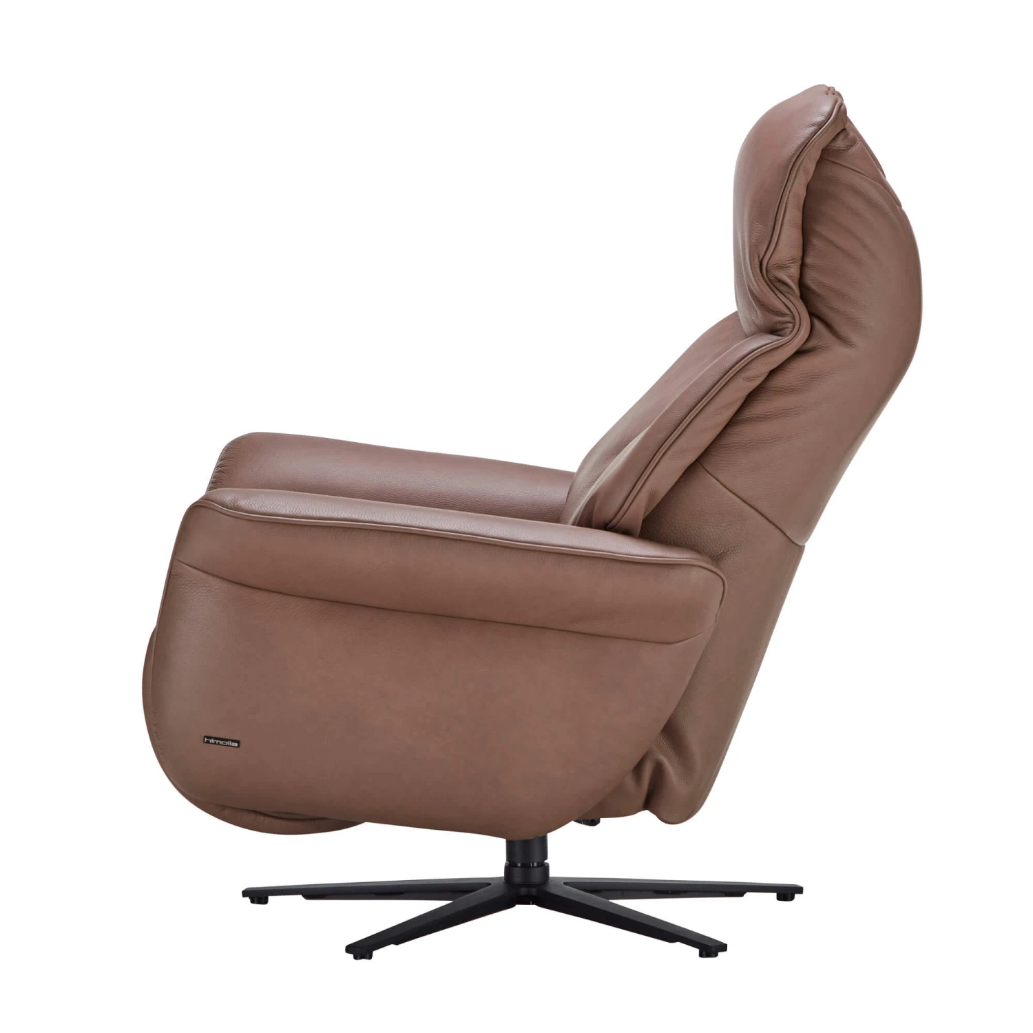 The Himolla medium recliner is a luxurious chair designed for ultimate comfort and relaxation. Its tall back and generously proportioned seat, accented with elegant piped seams, provide unparalleled support. Sink into the cloud-like softness of the foam filling, as it cradles your body and melts away stress. The timeless design, highlighted by the distinctive piped seam and single tufted value, adds a touch of sophistication to the comforting recliner. Upholstered in a soft brown leather, it creates a cool and comforting feel.