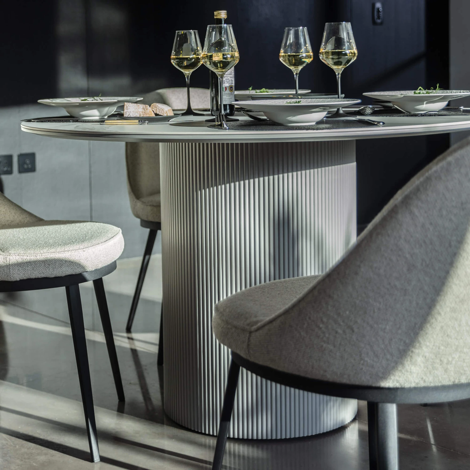 The reeded, cylindrical base lends this table its attractive, industrial-urban flair and is finished in a matte light grey for contrast. Accompanied with its clean lines and overall simplistic style, the Irina Dining Table is well suited to many interiors and colour schemes and is sure to transform your home with its refined, timeless, minimalist style.