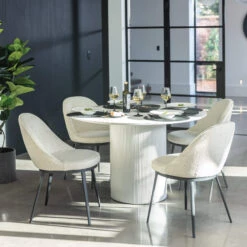 Make an elegant statement in your dining area with the Irina White Marble Effect 119.5cm Round Dining Table. Modern with an undeniable air of understated sophistication, the Irina is the perfect blend of classic style and contemporary details. Featuring a white ceramic top with varying veins and blooms in grey for depth and texture, the Irina Dining Table is a visually stunning piece with an authentic, natural marble look. The reeded, cylindrical base lends this table its attractive, industrial-urban flair and is finished in a matte light grey for contrast. Accompanied with its clean lines and overall simplistic style, the Irina Dining Table is well suited to many interiors and colour schemes and is sure to transform your home with its refined, timeless, minimalist style.