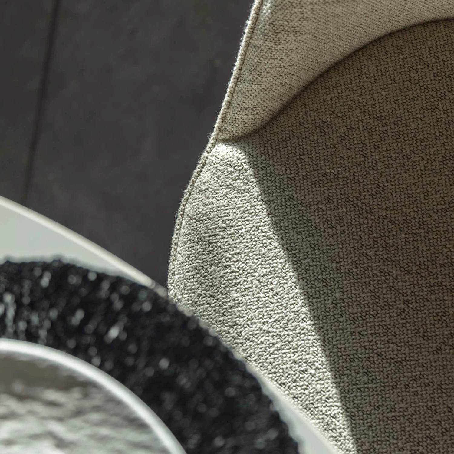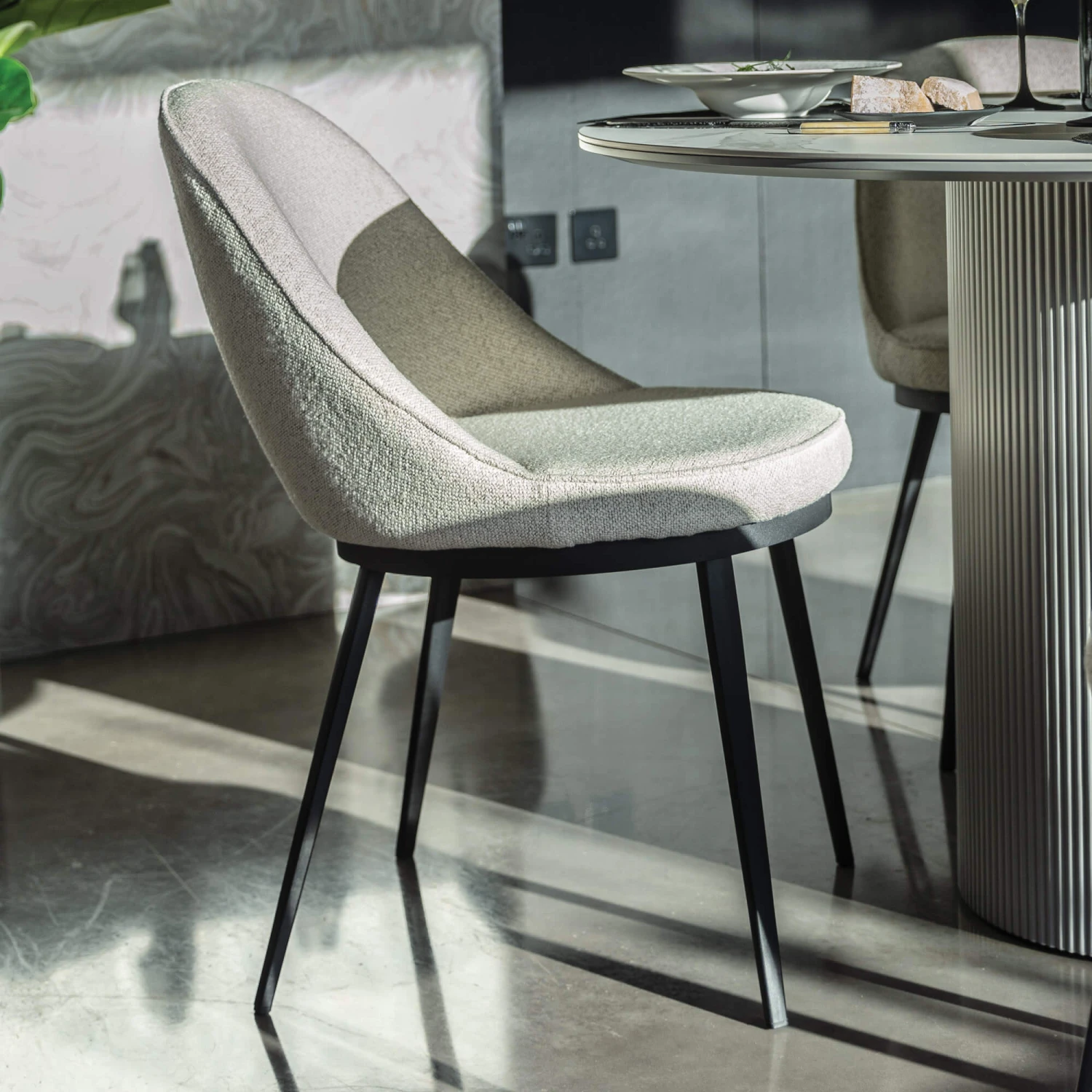The encompassing back and rounded seat are generously padded for comfort and lend this chair a timeless quality, whilst the splayed, matte black metal legs further elevate the modern appeal of this piece. Accompanied with its central seam, adding the merest hint of visual interest to the back, and cloud white boucle fabric, with a visible tactile texture which helps to soften the sharp, clean lines of this chair, the Futura Dining Chair is sure to make a style statement in any modern dining area or open plan living space.