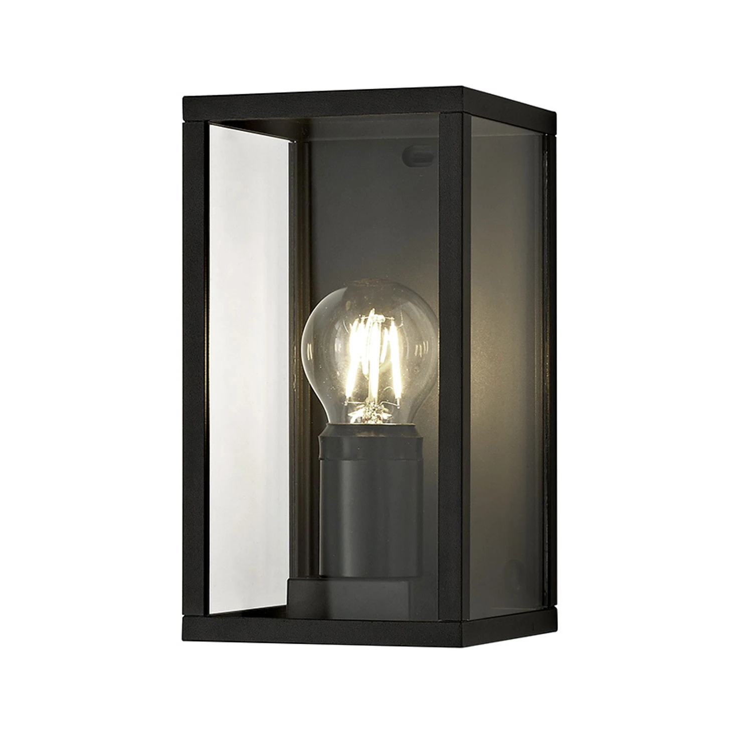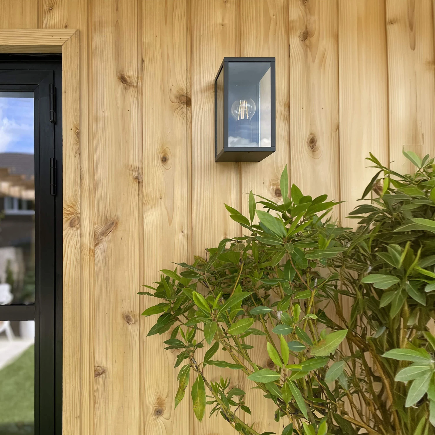 The Jama Graphite Black Outdoor Wall Light features a three dimensional frame with glass panels, drawing inspiration from traditional oil lanterns. The graphite black finish offers durability and longevity against outdoor elements and harsh weather.