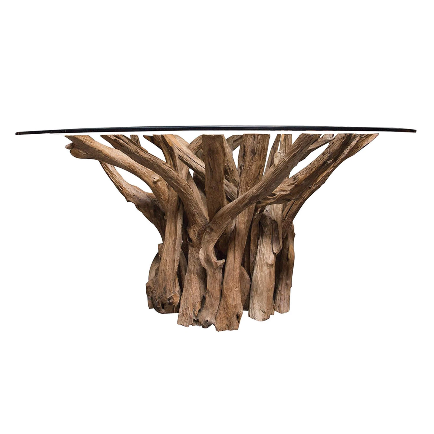 Beautifully crafted, this 130cm dining table has a round glass top and a base made from sustainably sourced reclaimed teak root wood; providing a unique and striking focal feature for your dining area. The table combines the beauty of natural wood with contrasting clear glass, and the fusion of modern design with a raw edge allows the table to complement a range of interiors.