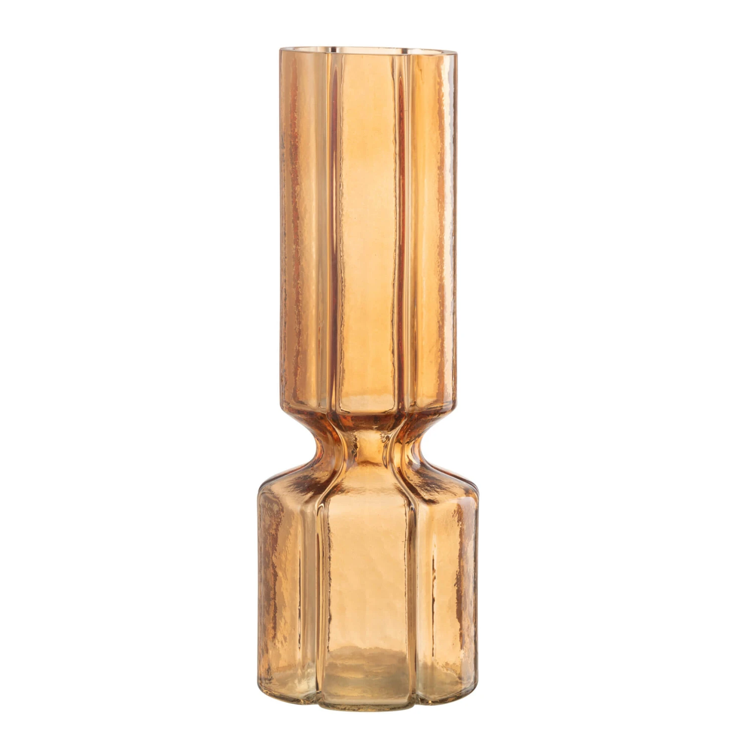 A tall, rounded glass vase in a wonderful vibrant orange hue. The reeded vase is made from a obscure glass creating a textured look adding a subtle vintage style to the vase.