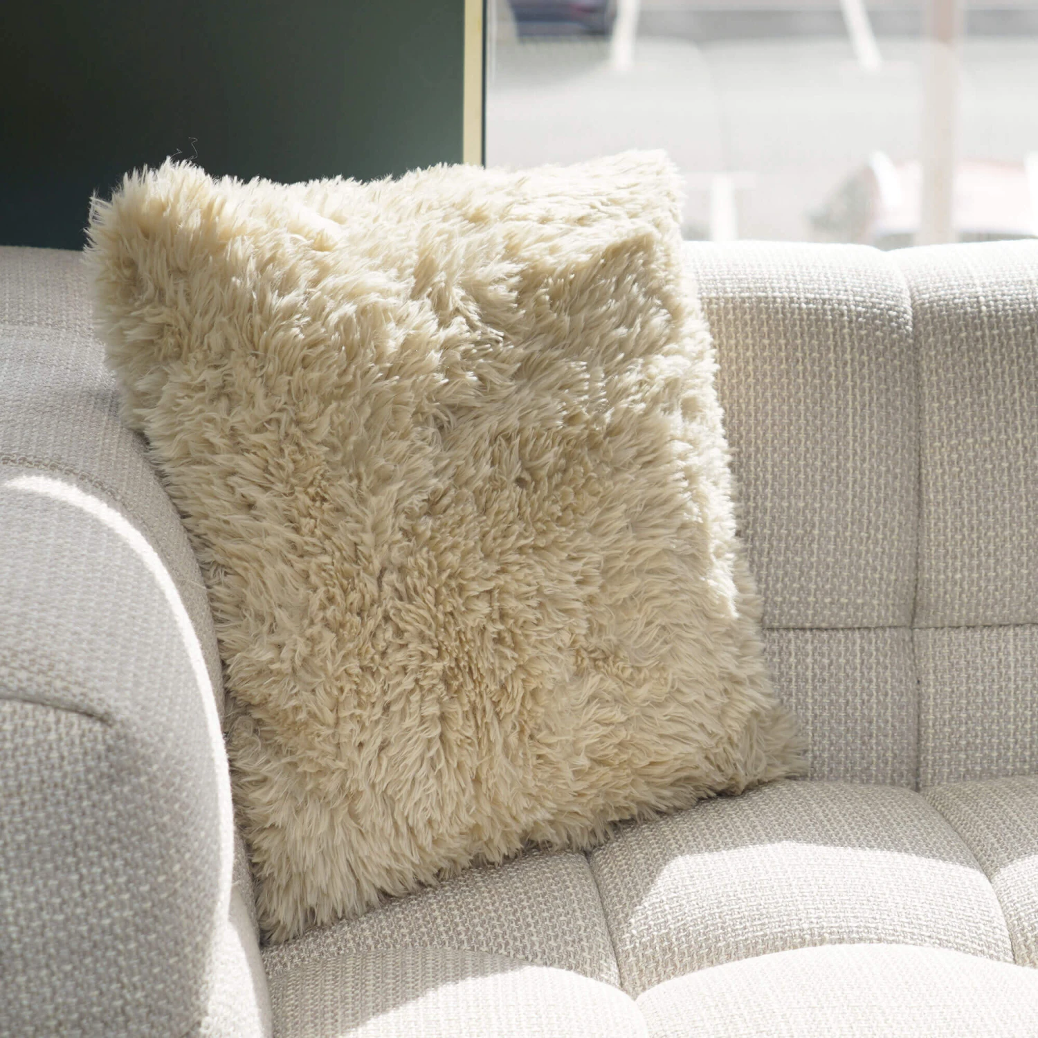 Snuggle up by the fireside in lavish style with the Joanna Sand Beige Faux Sheepskin Square Sofa Cushion. Upholstered in a sand beige faux sheepskin fabric with a feather filling, the Joanna cushion is perfect for further creating a snuggly, inviting and impactful corner in your home. Inspired by the aesthetics of a rustic, ski-lodge retreat, the Joanna cushion features a square shape and a textured effect to effortlessly create a chic look that complements the irresistibly soft and premium-quality polyester, to deliver a refined and versatile design.