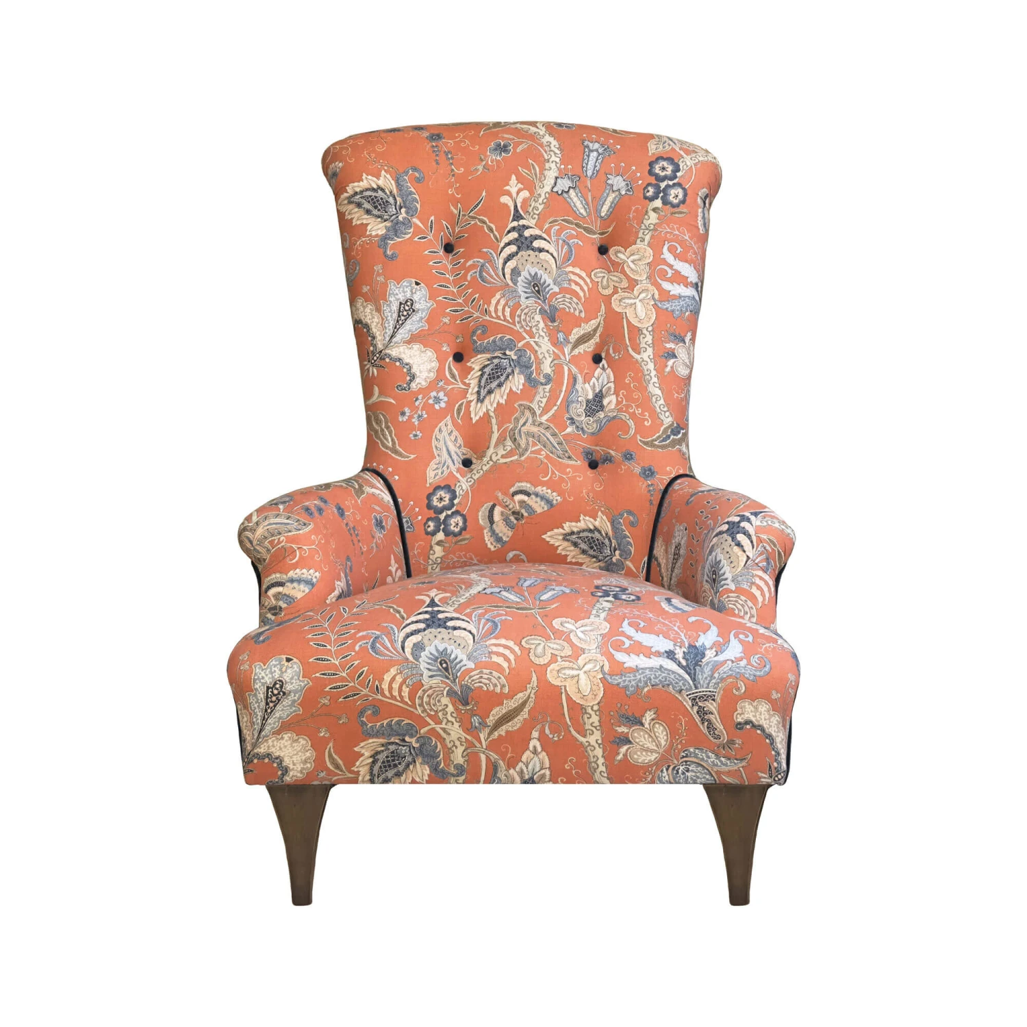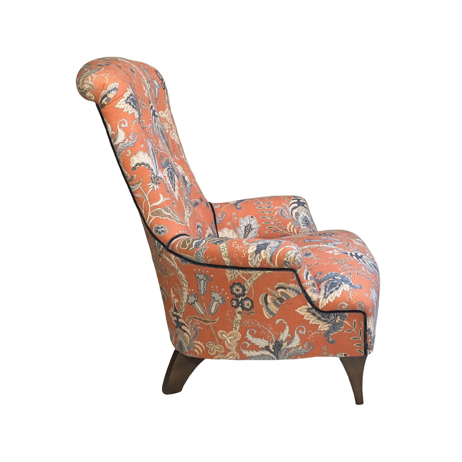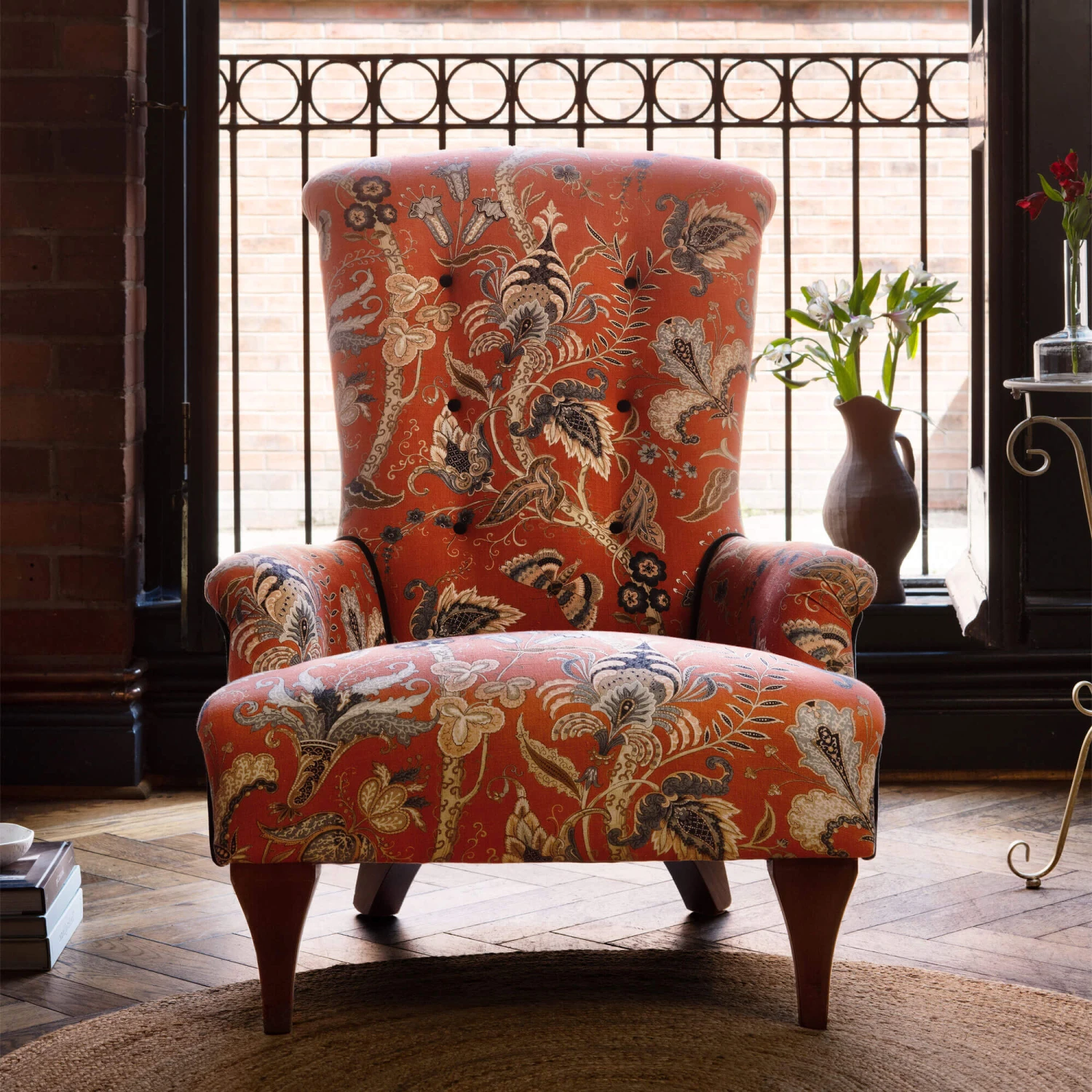 The Hawthorne Uharu Tomato Fabric Chair from John Sankey marries elegance with bold artistry. Upholstered in a patterned Uharu Tomato fabric, the Hawthorne features graceful lines, a high, sculptural back design providing an air of grandeur, a deep cushioned seat inviting relaxation, gently curved arms offering support, Carrington Midnight piping and values and beautifully tapered antique oak hand polished solid beech legs for a refining finishing touch, creating a dramatic yet timeless statement able to enhance the chair’s striking presence.