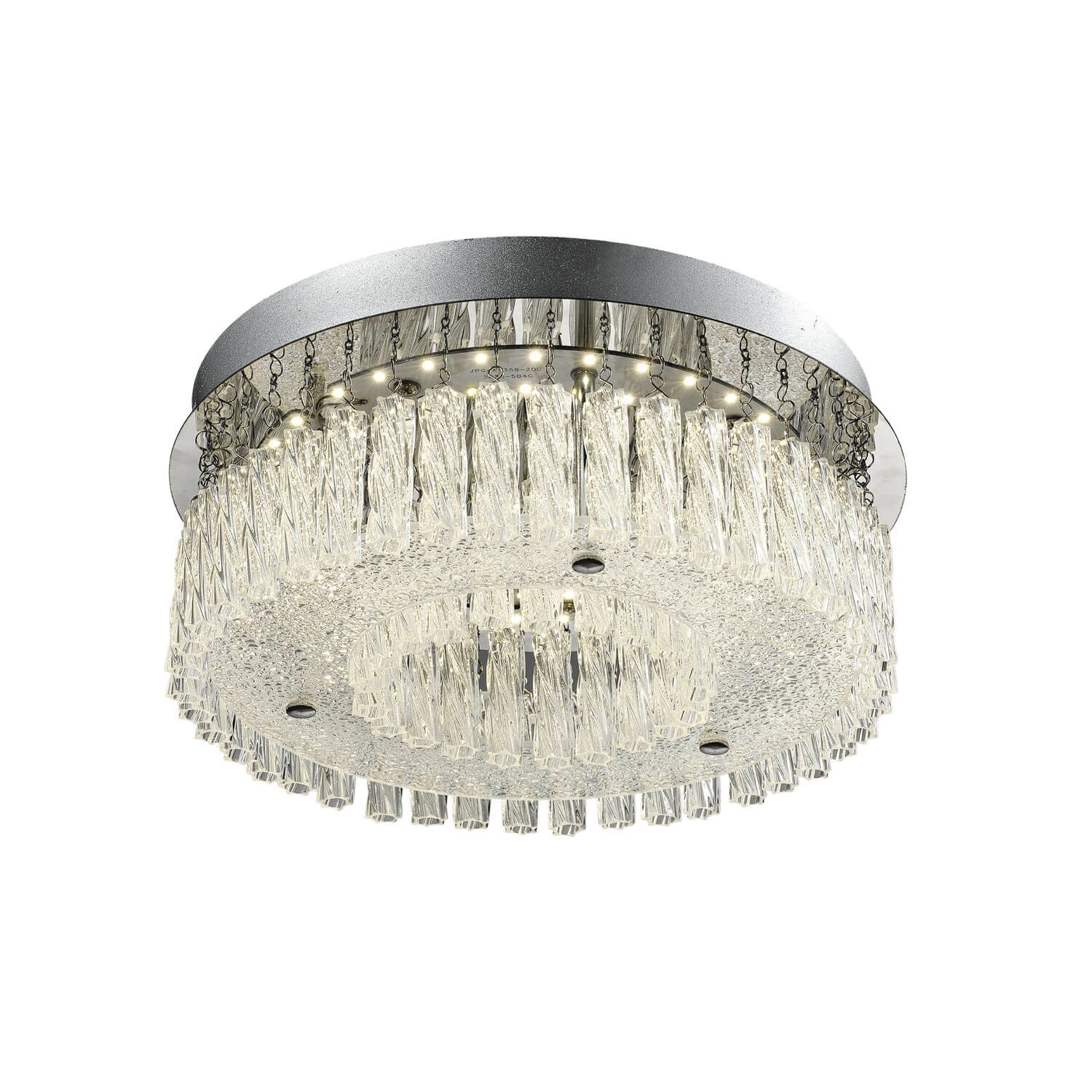 The Joycele is an elegant ceiling light, featuring a mirrored chrome ceiling plate, integrated LEDs and hanging glass crystals. Measuring 36cm in diameter, this is a statement piece to add a glamorous touch to your living space.