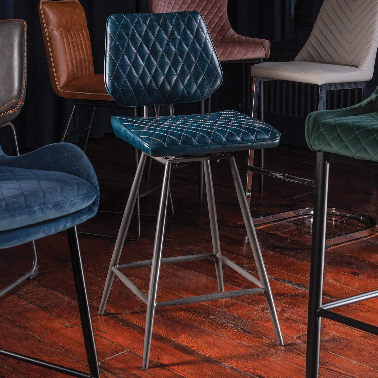 The chair features a quilted design stitched in to the fabric of the backrest and seat, enhancing the overall style of the chair and ensuring that it looks excellent from all angles. This bar chair perfectly complements industrial interior designs and features versatile dark metal legs.