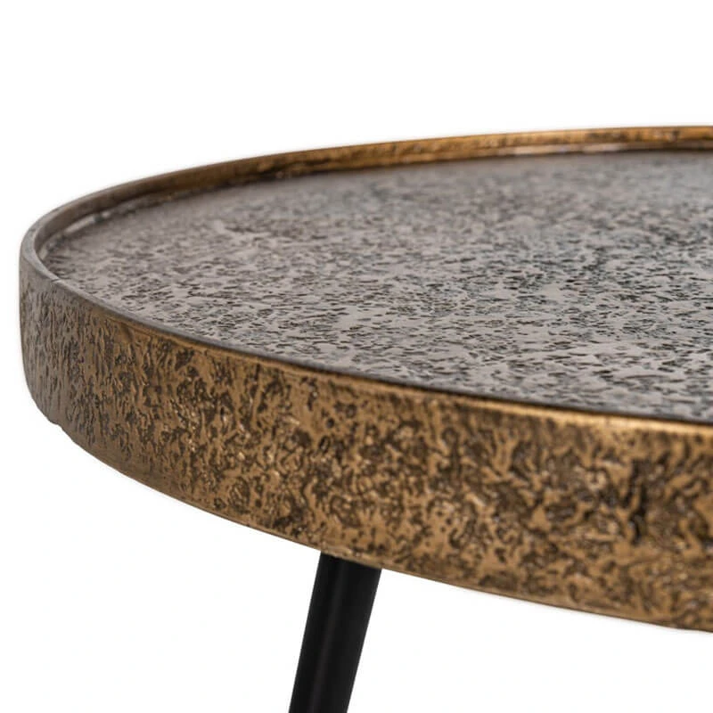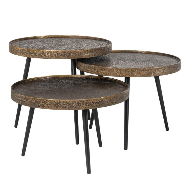 A set of 3 metal coffee tables in various sizes with a slight lip up the side for a tray like feature resting on three sleek black legs on each. Complete with a antique gold textured finish adding a vintage style to your home wherever you choose to style.