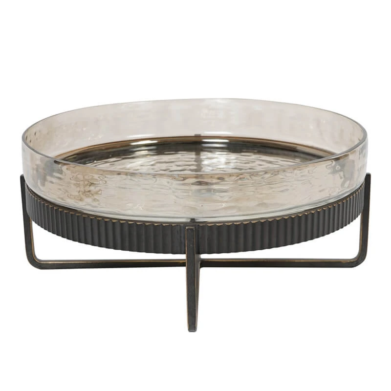 A short smoked glass bowl that features a raised ribbed base. The metal ribbed base compliments the brown, hammered glass bowl adding character to your space.