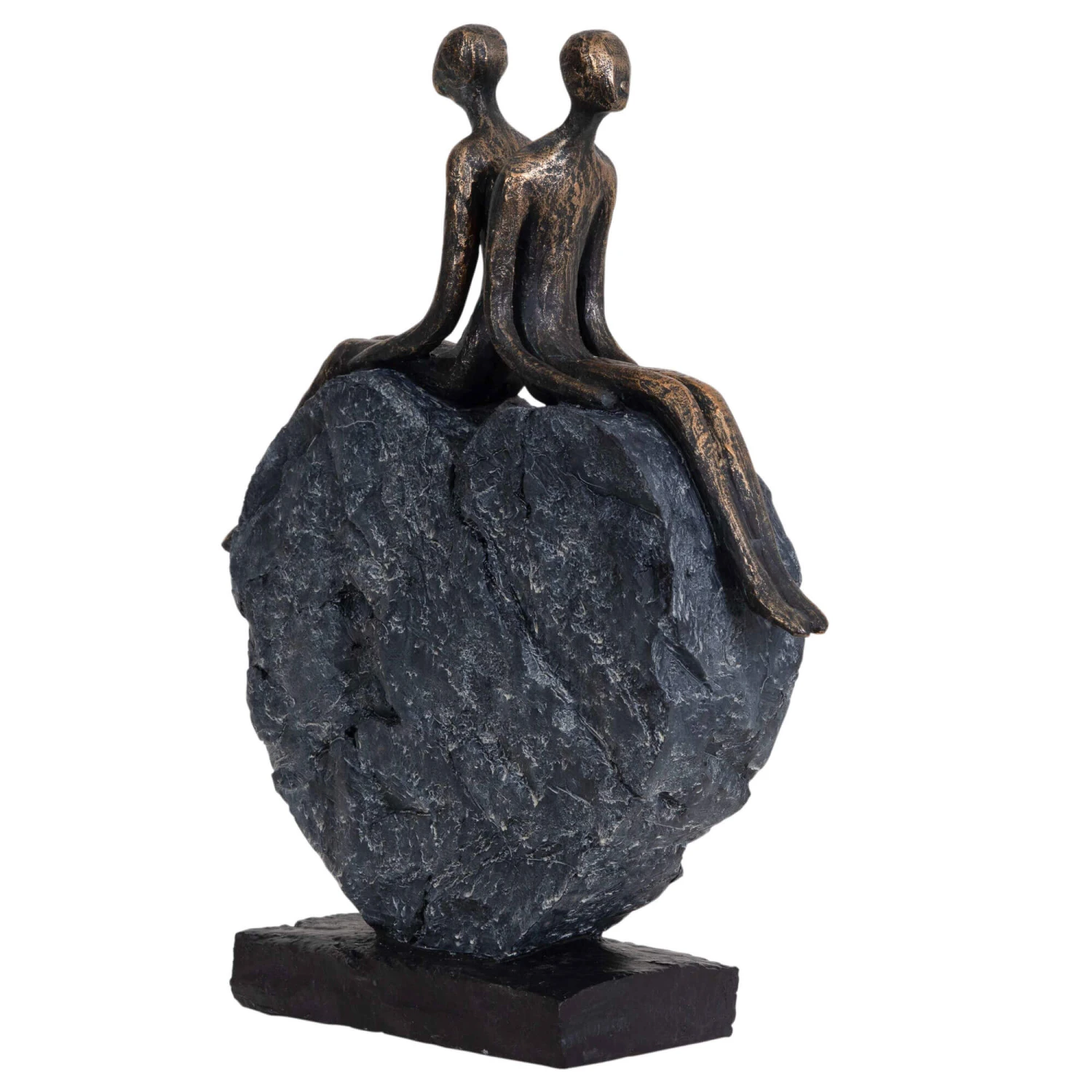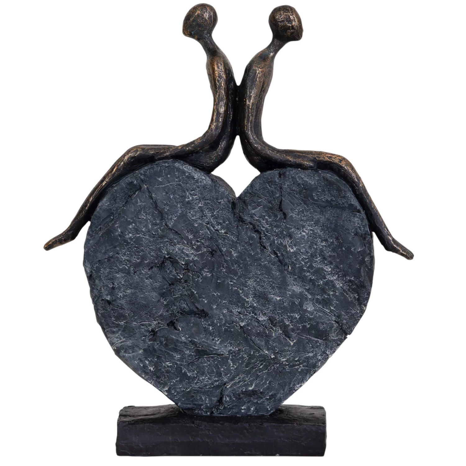 Feel the love in your home with this beautiful sculpture. The abstract design depicts two humans sat back to back on top of a heart, Finished in bronze with a blue-tone copper base.