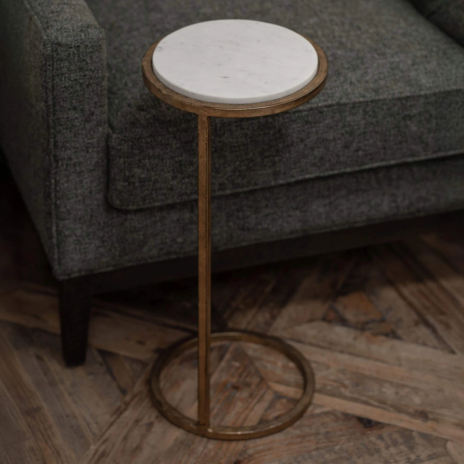 The Libra Iota White Marble Accent Side Table is a striking blend of contemporary elegance and refined simplicity. Its brushed brass coloured circular frame exudes a subtle sophistication, perfectly complementing the floating white marble top that appears to hover gracefully within the round structure. The marble surface itself is a vision of understated luxury, featuring bright white tones interlaced with soft, subtle grey veining. A singular, sleek metal rod supports the accent table top, enhancing the table’s light and airy aesthetic while creating a captivating floating effect.