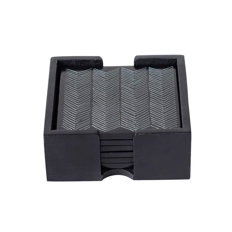 A simple set of 6 coasters, with each coaster featuring white chevrons that work their way up the coaster. The arrows are each slightly different, breaking away from uniformity and adding character to the coaster.