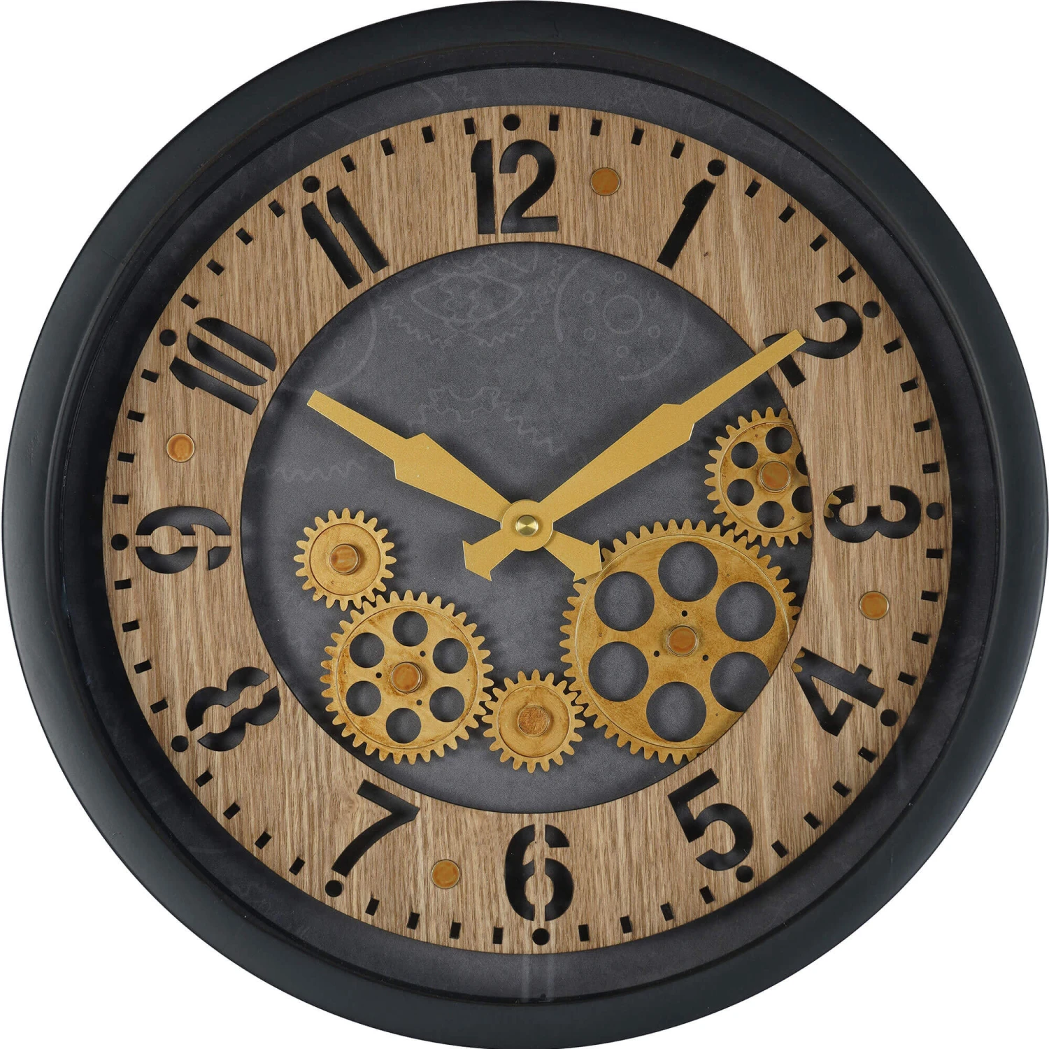 The Palladium Mini Dials Black Clock features a painted black frame with intricate wooden dial cut-outs. Bold gold hands stand out against the black centre, while five moving brass gold cogs add visual appeal. This clock is the perfect blend of sophistication and innovation.