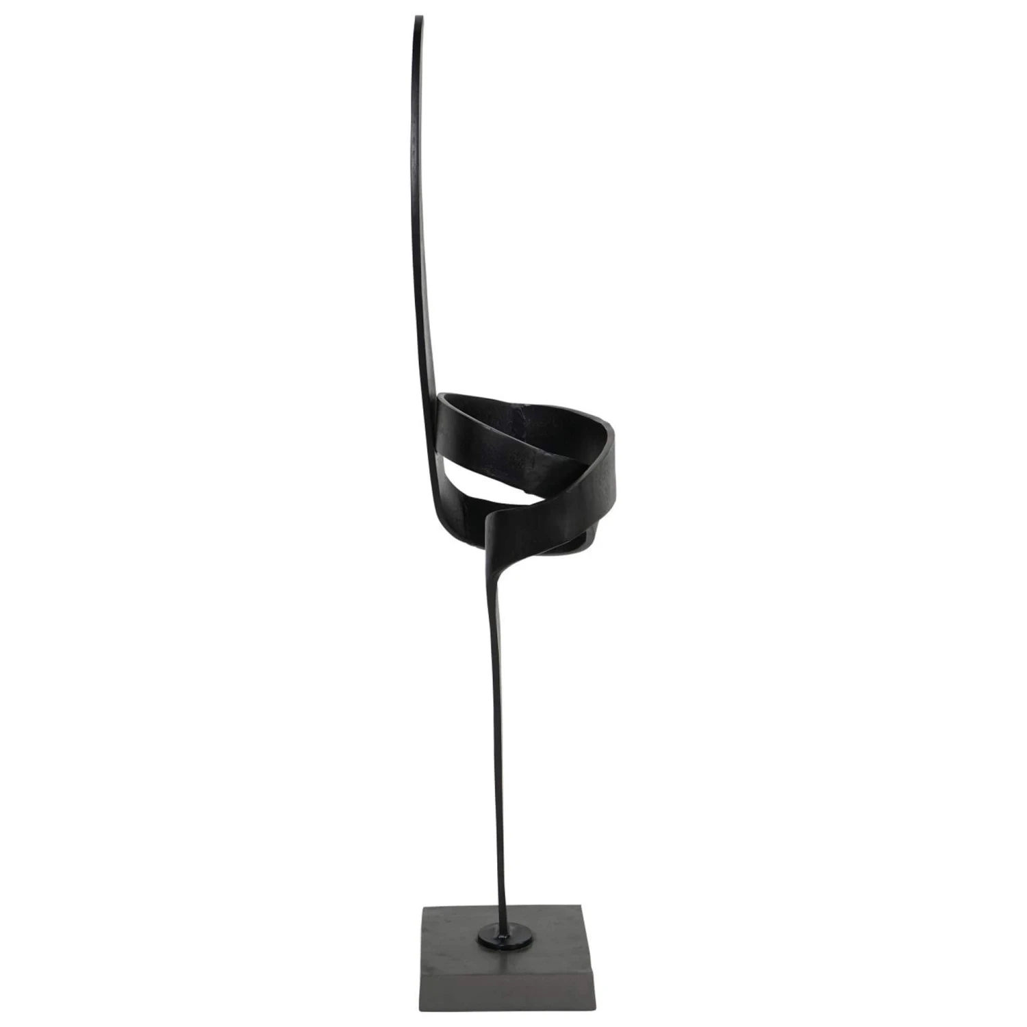 A wonderful upward spiral sculpture that features a knot in the middle. The warped piece of aluminium has a textured, matte black finish. With a large square base, it provides the contemporary abstract sculpture with a stable foundation.