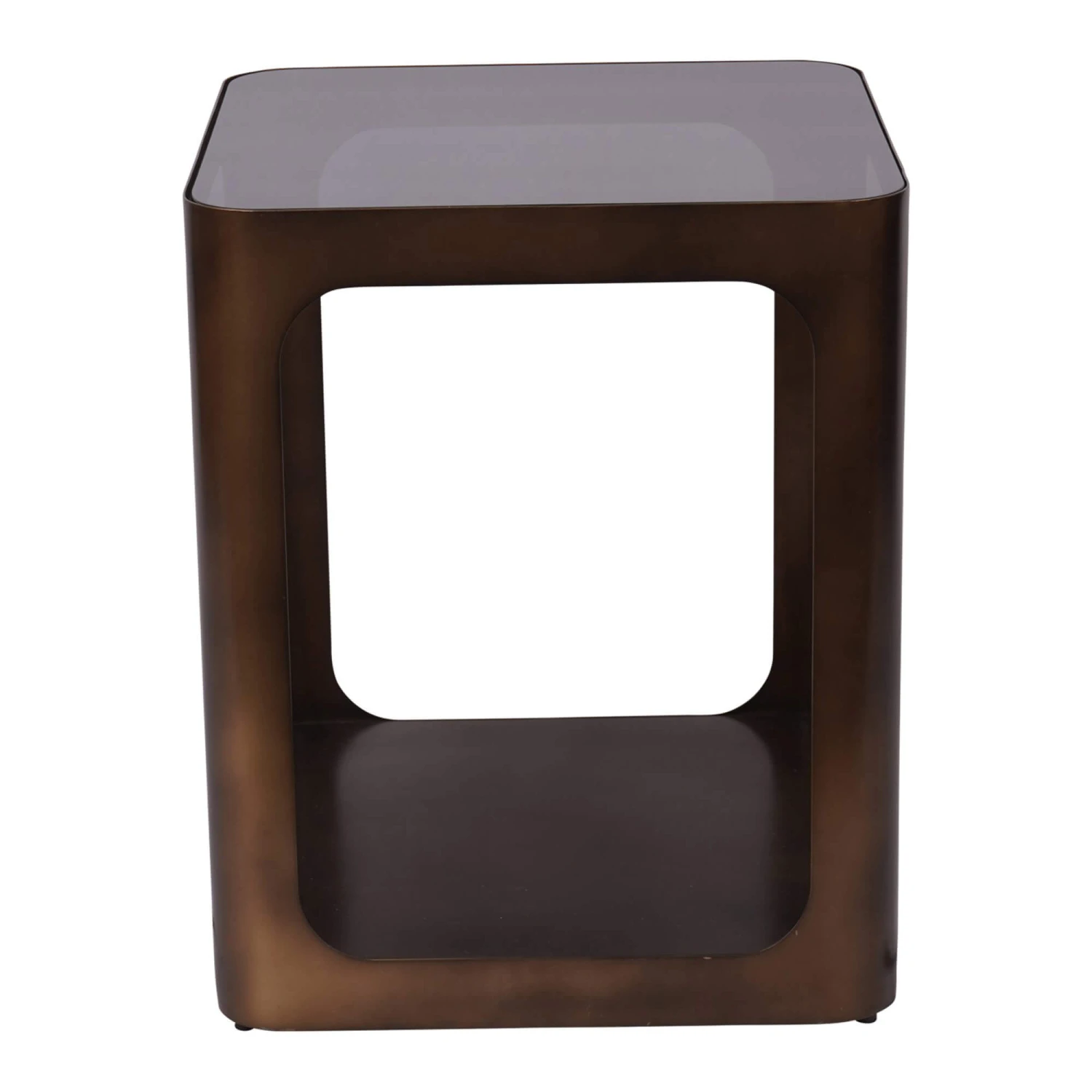 Featuring a clear glass top, this large antique brass effect side table features an open base creating a light, airy look. Each edge has softly rounded corners that match the inside arches of the table creating a cohesive, contemporary silhouette.