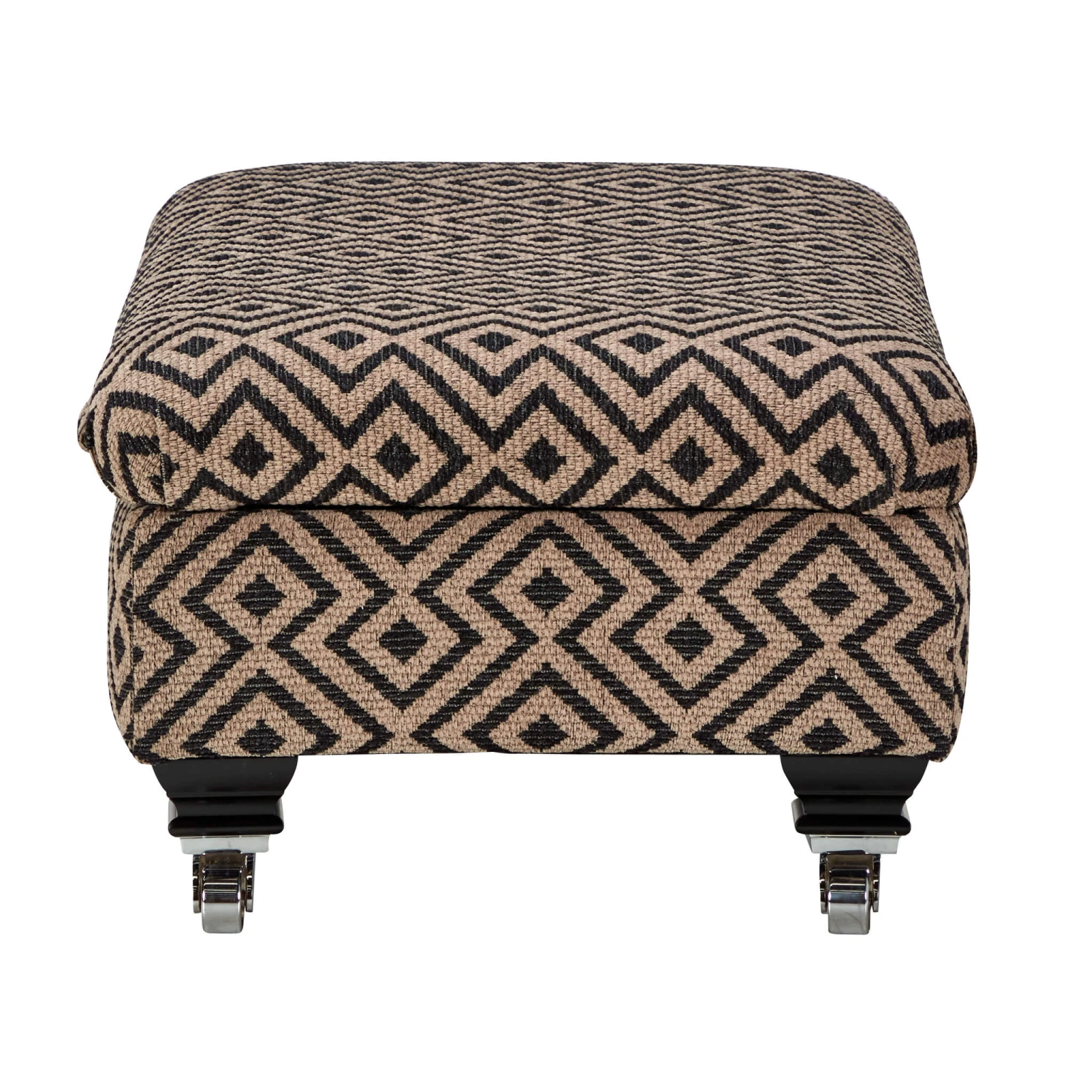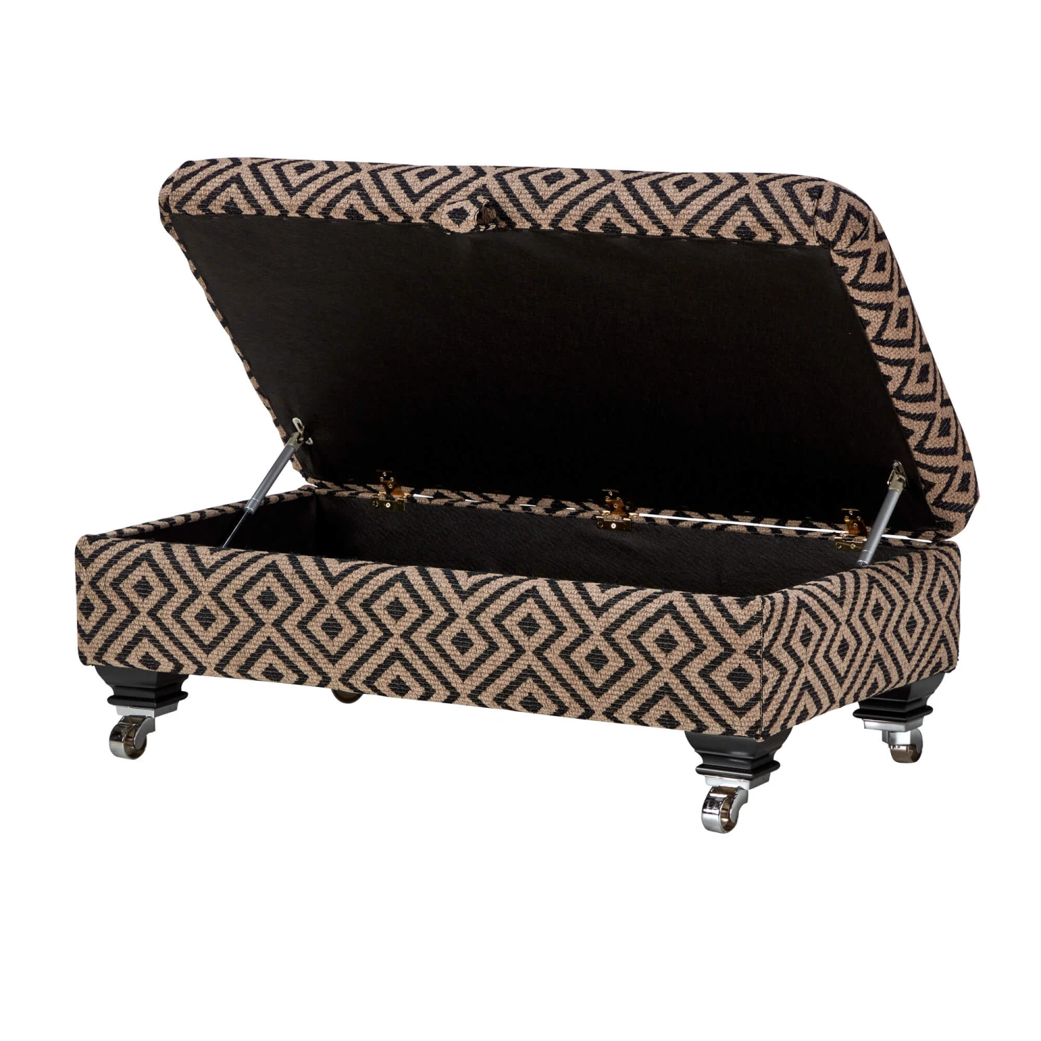 Add that perfect finishing touch to your lounge or living area with the Lucinda Black & Natural Patterned Fabric Ottoman Legged Footstool. Featuring a generously proportioned top with a cold cure interior, which conforms to the natural contours of your body, the Lucinda was made with relaxation in mind. The top lifts to reveal a handy, hidden storage compartment and the front of the top has a fabric tab, so you can access the storage section with ease. Accompanied with its unique, geometric patterned fabric upholstery and solid ebony legs with polished chrome castors, the Lucinda Legged Ottoman is easily manoeuvrable and offers practicality and comfort, without compromising on style.