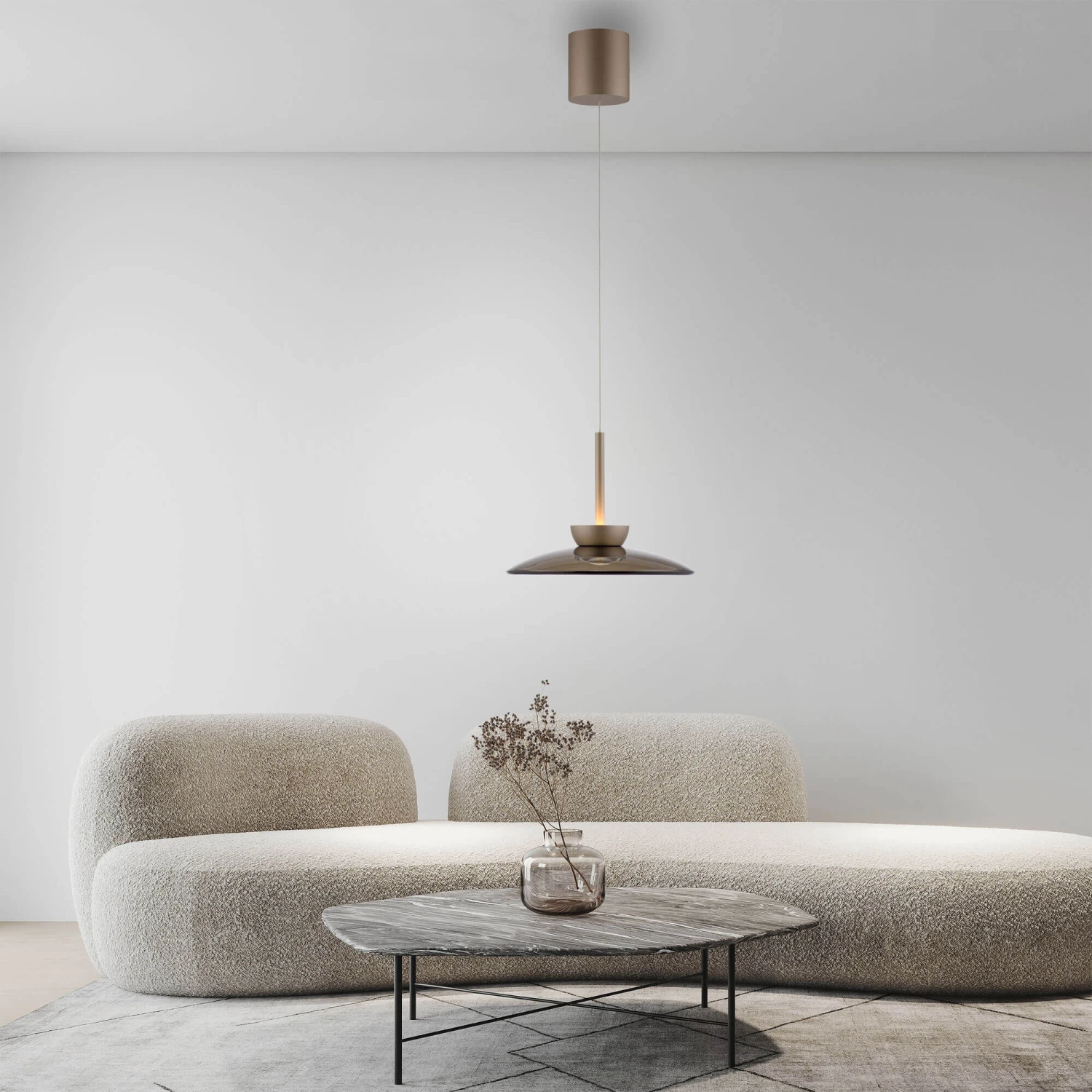 The Luna Bronze & Dark Amber Glass Pendant Light introduces timeless elegance with modern technology. Illuminated by an LED light source emitting a warm white light, this sophisticated pendant light features a cylinder bronze metal base combined with a round dark amber glass shade, providing a cosy and inviting ambience. Dimmable via a separate Tronic dimmer, the brightness can be adjusted precisely according to your desired mood while the Comfort-Lift function enables the height of the light to be easily adjusted thanks to the built-in mechanism in the canopy, offering full flexibility for every situation. Adjustable in height from 60cm to 200cm, this stylish pendant light is the perfect mix of design and quality, making it ideal placed in any contemporary home, whether it be in your living room or above the dining table.