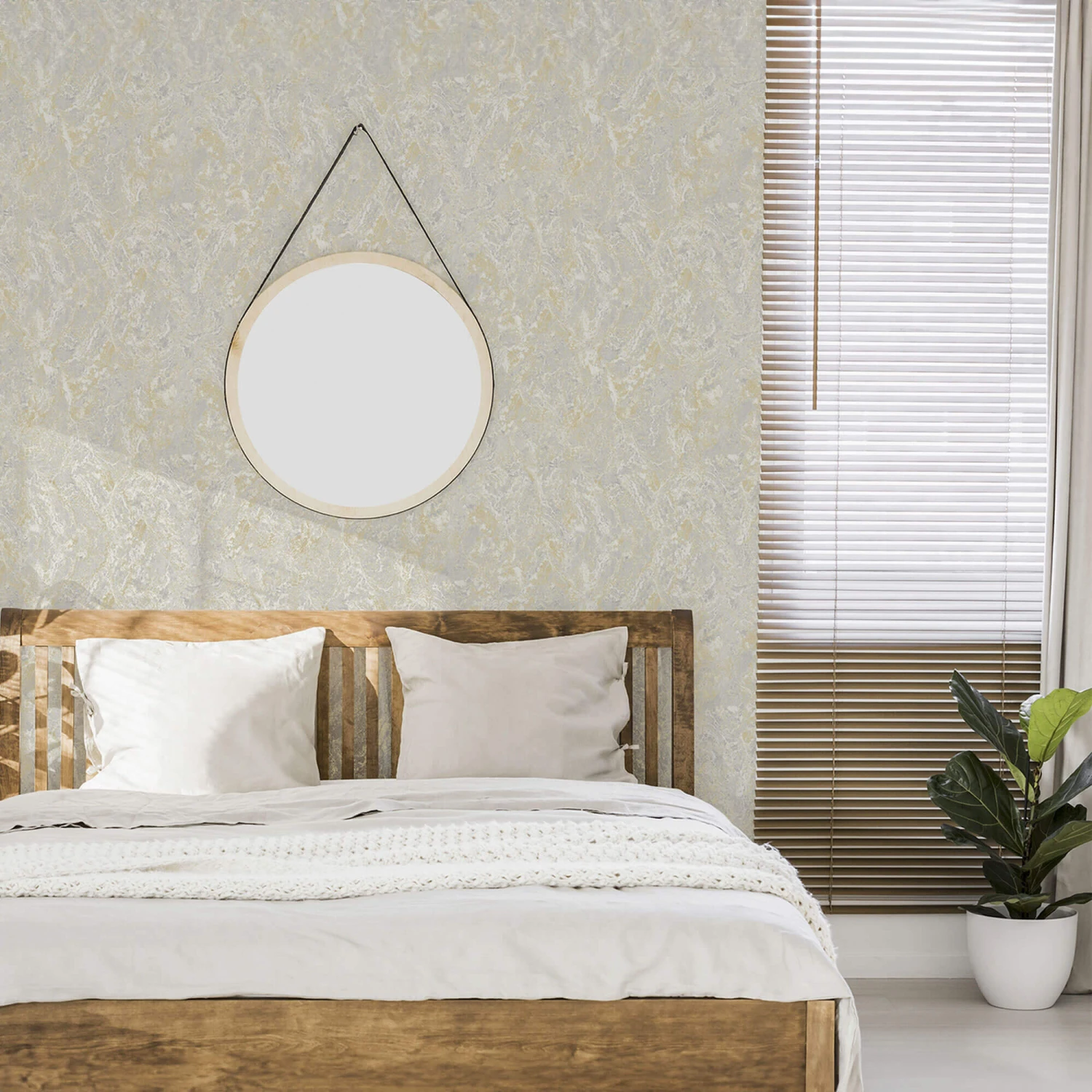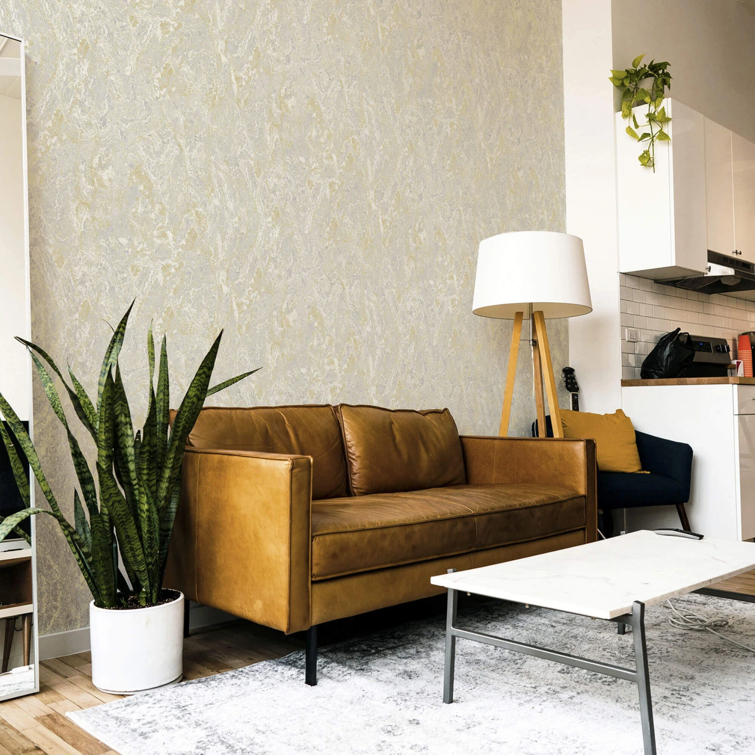 Add luxury to your home with this soft gold marble wallpaper. The contemporary marble design is a twist on the trendy marble papers. The Marble Patina fuses natural tones with embossed metallic highlights that when hit by the light adds style and class to any living area. The wallpaper is a versatile option that works in a dining room, kitchen, living space and study, it is the perfect addition to add some texture while allowing you to decorate the rest of the space however you desire. Suitable for most rooms except high moisture environments, like bathrooms.