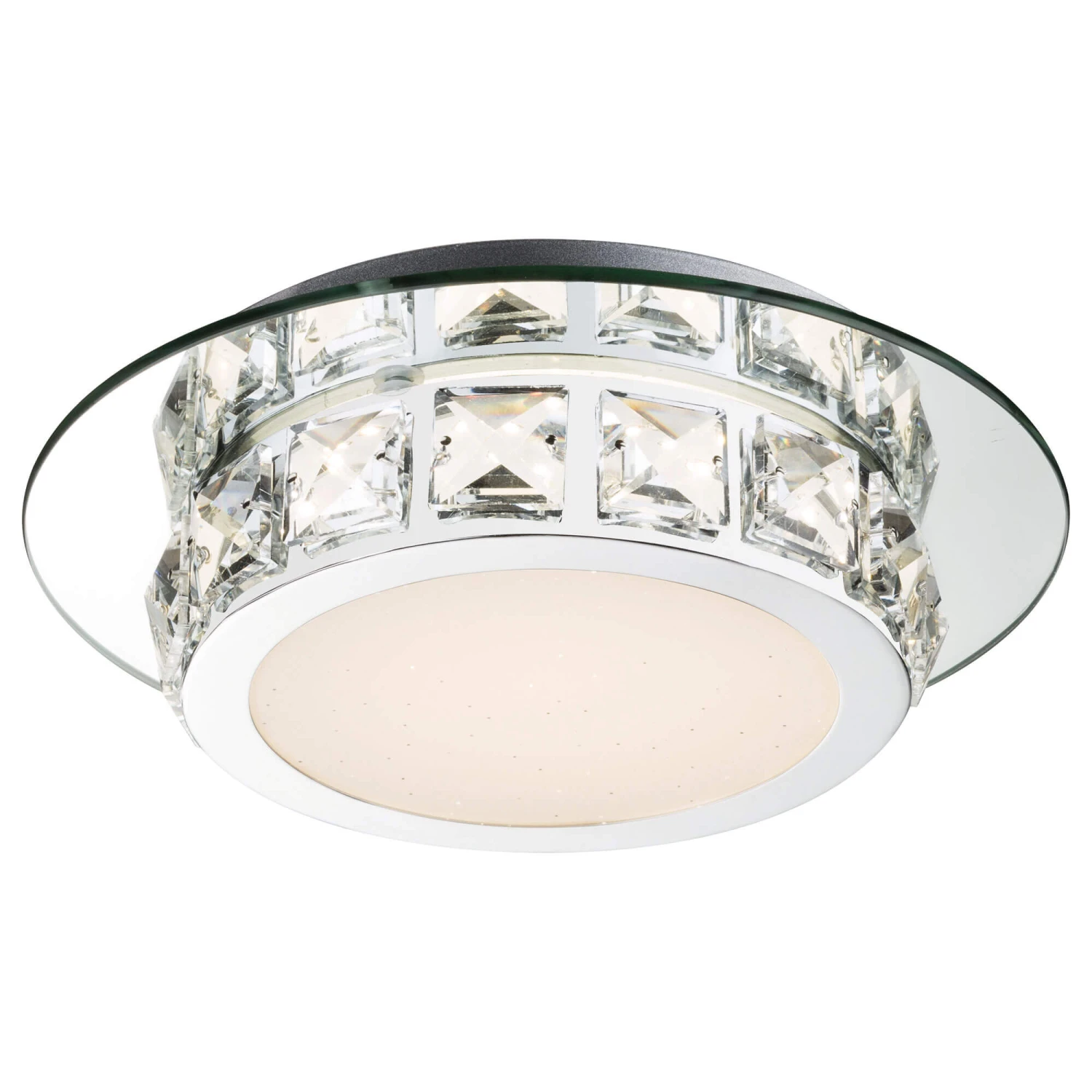 A luxurious flush ceiling light with a chrome frame and glass crystal accents. The Margo is a round ceiling light that measures 25cm in diameter, with an integrated 4000K LED and an opal diffuser to cast a gentle illumination in your space.