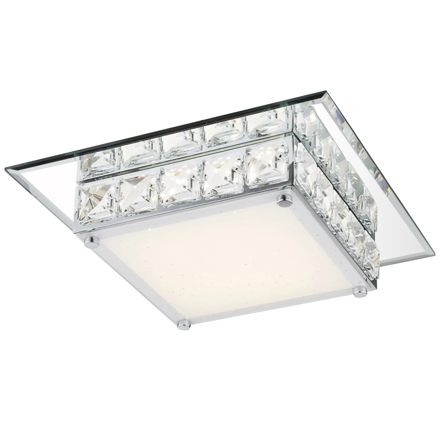 This luxurious square ceiling lamp from the Margo series impresses with its seemingly inviolable look. The shade in chrome with mirror edge and opal glass, decorated with clear K5 glass crystals, sets bright accents in every room. With a size of 25cm, a light colour of 4000K and a thickness of 720 lumens, this model is a real eye-catcher and would look stunning in any room in your home.