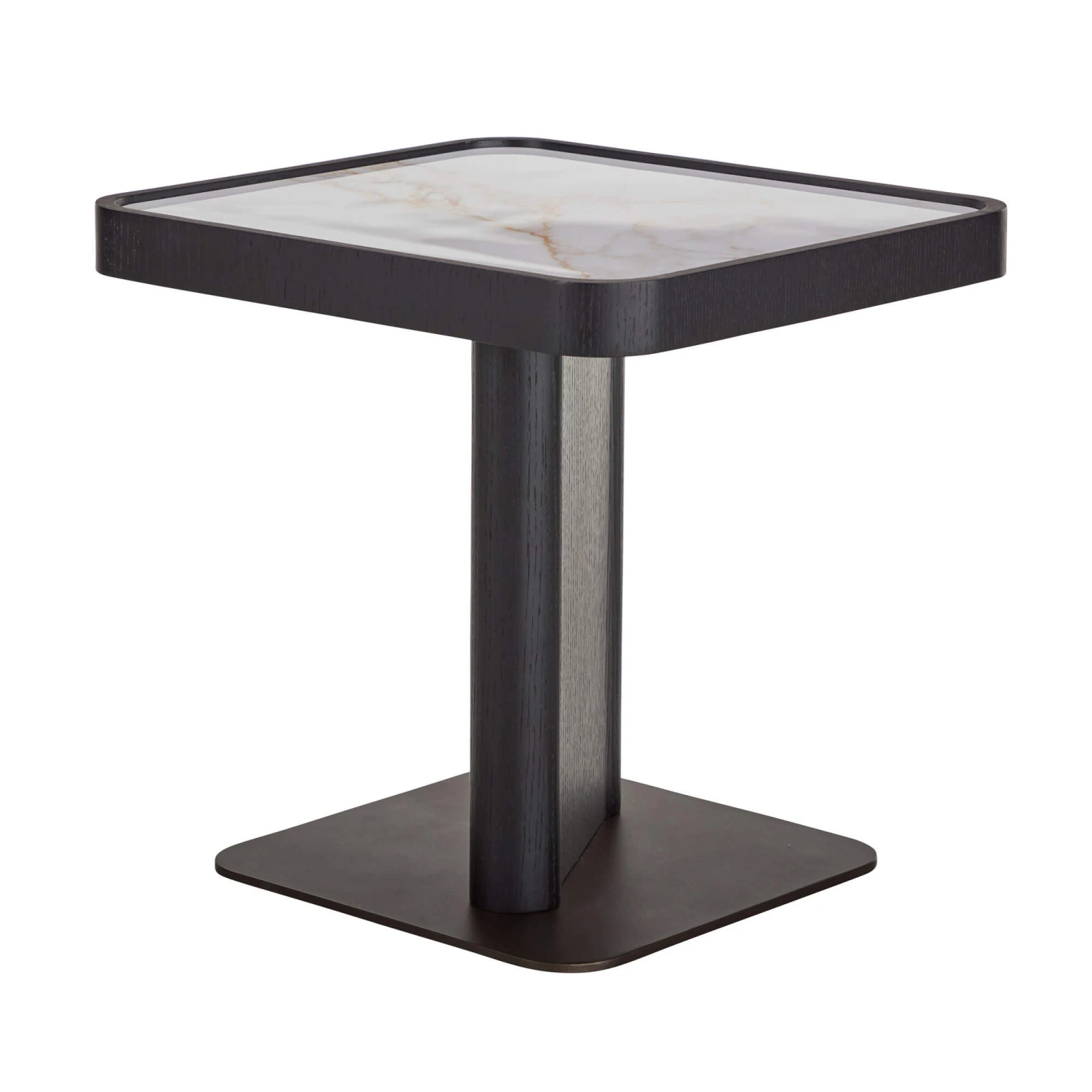 The Milano side table features a sturdy, dark bronze metal base with a subtly raised lip that gracefully encircles its perimeter, providing a refined and grounded foundation. Ascending from this solid base is a distinctive podium middle, crafted from black wood, which supports the table’s stunning top. The tabletop showcases a rich black finish that is recessed to cradle a vibrant white marble top. The marbles natural veining and unique character adds an element of timeless beauty.