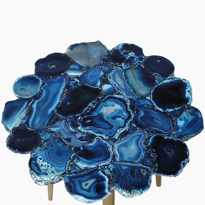 Bring in a natural touch to your living space with this sleek agate end table. The table top is crafted with beautiful segments of blue agate quartz stone that create a unique piece with a raw edge making each piece is unique to your home offering an extra space for displaying your favourite accessories. Resting on 3 sleek metal gold coated legs for a luxurious finish.