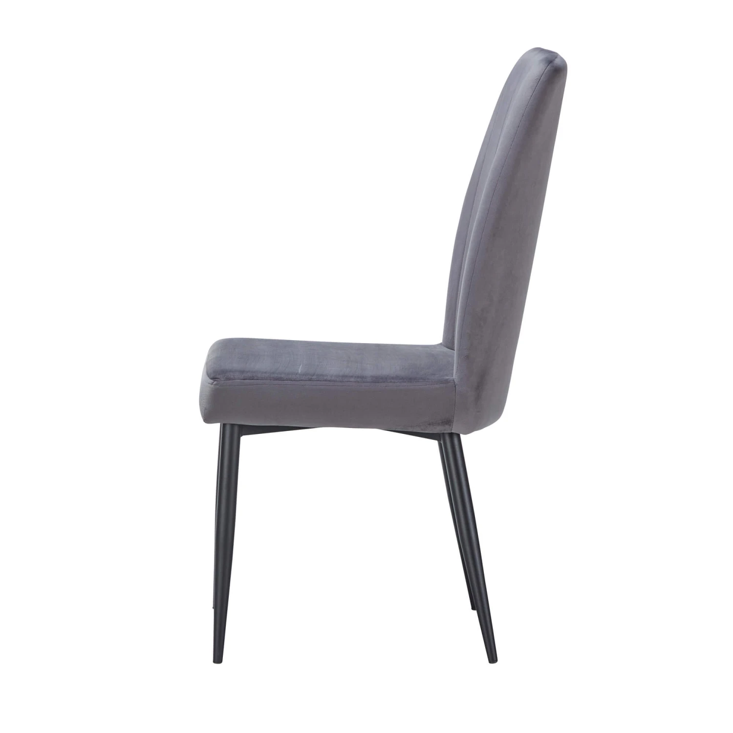 Elegantly sophisticated with its soft curves and simplistic style, the Bettina Light Grey Faux Leather Dining Chair is minimalist design at its finest. Designed for the modern home, the Bettina features a sleek, clean outline and understated details that will compliment many interior styles. Channel tufting creates a vertical panel-effect along the backrest, adding depth and an element of texture, whilst the smooth, easy-to-clean surface of the light grey faux leather fabric makes a practical, hassle-free feature. Accompanied with its slender, tapered, matte black metal legs, lending this piece its industrial characteristics, the Bettina Dining Chair is the perfect accompaniment to any city apartment or contemporary decorated dining area, with its effortlessly chic style and alluring urban flair.