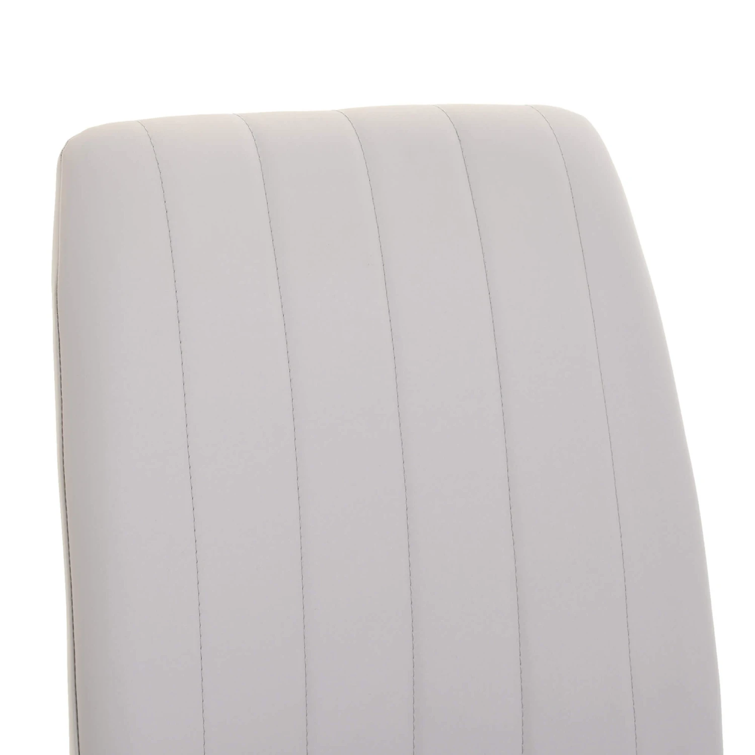 Elegantly sophisticated with its soft curves and simplistic style, the Bettina Light Grey Faux Leather Dining Chair is minimalist design at its finest. Designed for the modern home, the Bettina features a sleek, clean outline and understated details that will compliment many interior styles. Channel tufting creates a vertical panel-effect along the backrest, adding depth and an element of texture, whilst the smooth, easy-to-clean surface of the light grey faux leather fabric makes a practical, hassle-free feature. Accompanied with its slender, tapered, matte black metal legs, lending this piece its industrial characteristics, the Bettina Dining Chair is the perfect accompaniment to any city apartment or contemporary decorated dining area, with its effortlessly chic style and alluring urban flair.