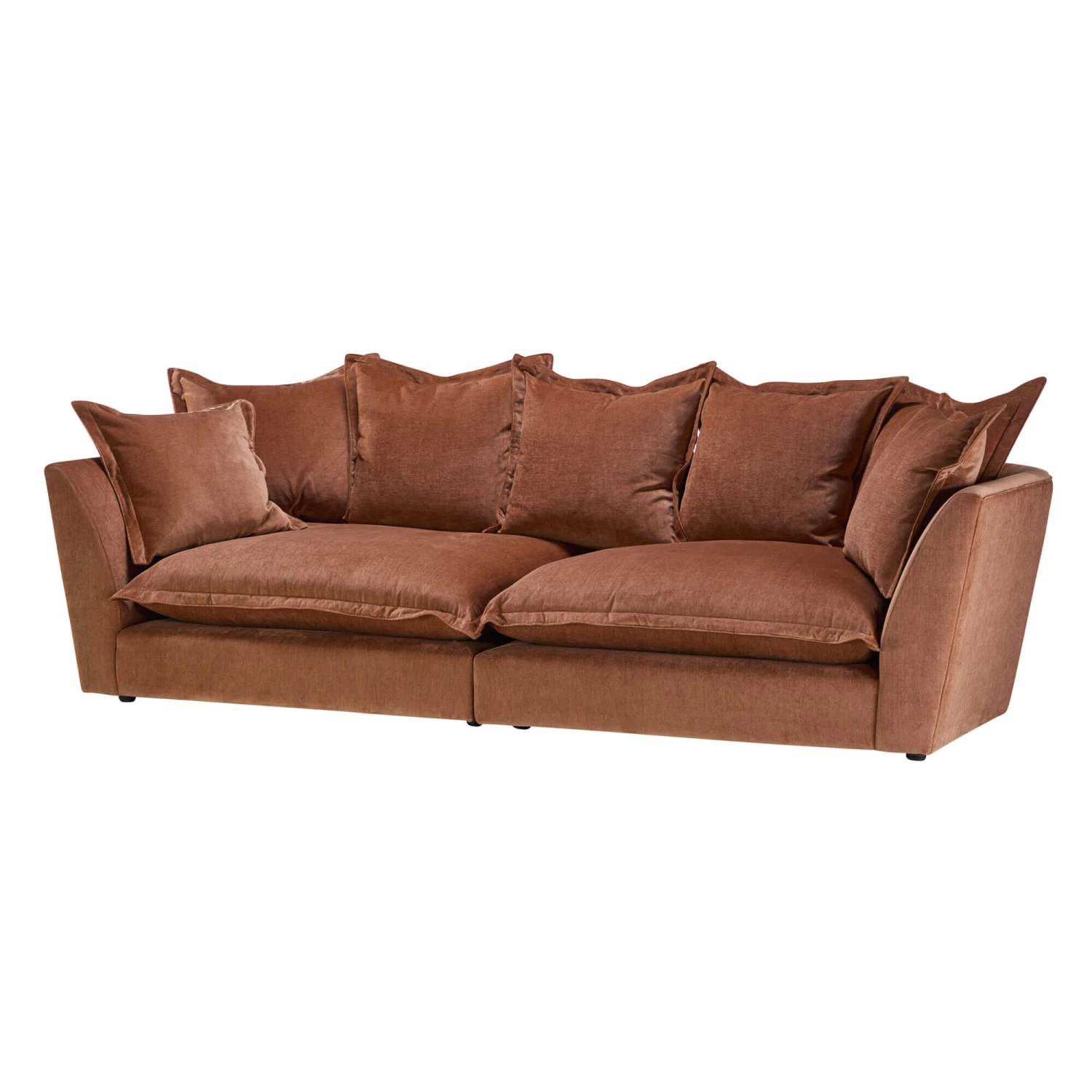 Oversized, oxford border style, pillow-back cushions enhance the enticing, leisurely appeal of this sofa and the 100% duck feather filling further elevates the luxe nature of this piece. Accompanied with its incredibly soft fabric upholstery with a lustrous look in a warm dusk apricot tone, the Nomad Extra Large Sofa exudes opulence and is sure to make a striking centre-piece in any living room, with its lavish design and air of splendour.