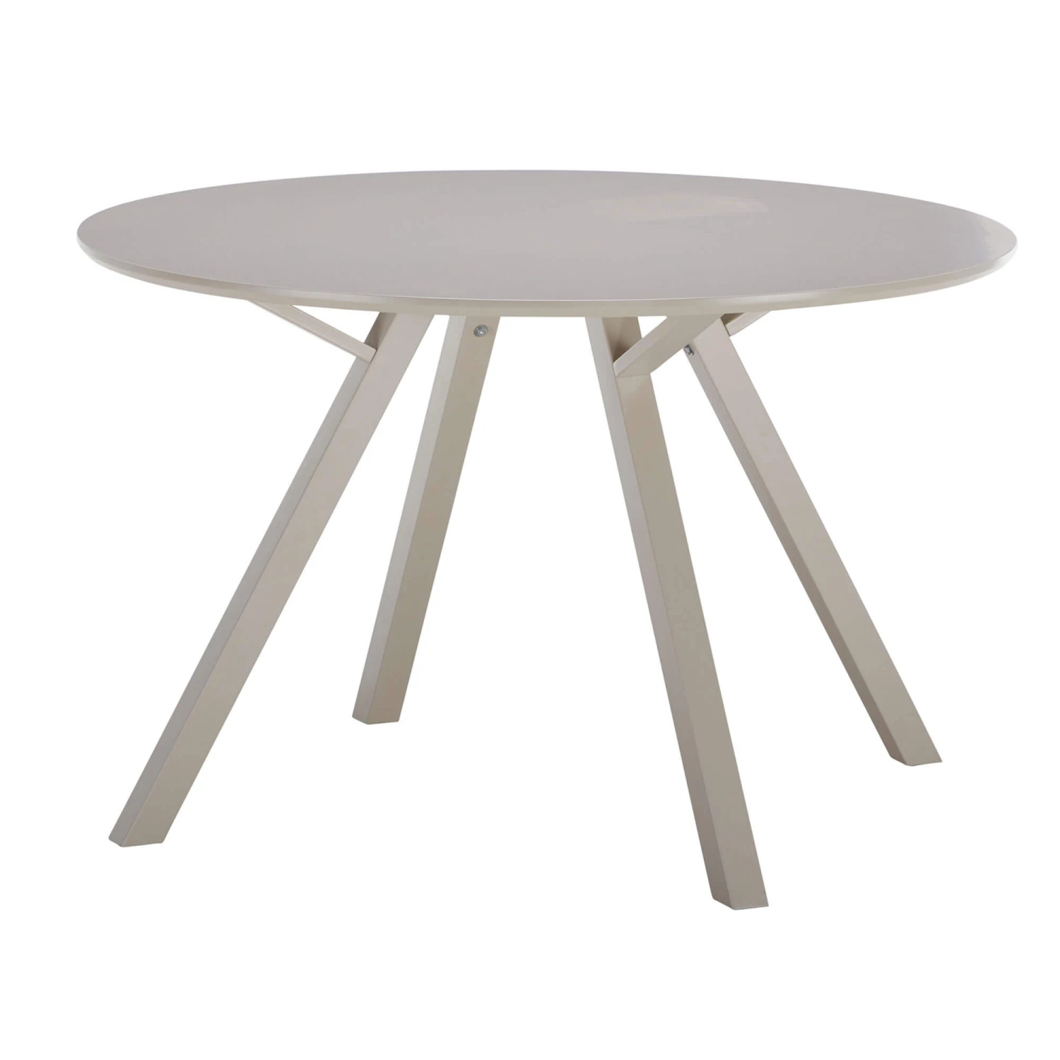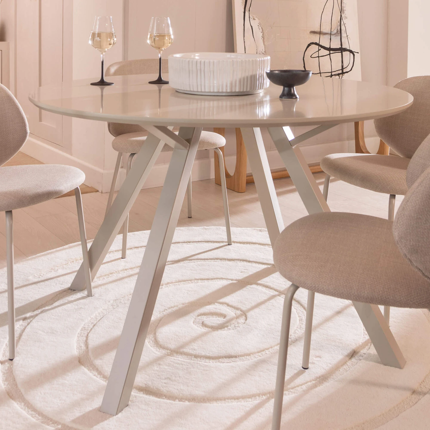 The Odense Round Taupe Dining Table combines elegance and functionality, making it a perfect addition to any dining area. Its soft cream or off-white tone enhances the aesthetic appeal, while the strong table top boasts a subtle sheen that adds a touch of sophistication. The design features four splayed legs, each supported featuring a smaller support beam that connects to the table top, ensuring stability and style. The flat edges are subtly rounded, contributing to a modern yet inviting look that seamlessly integrates into various décor styles.