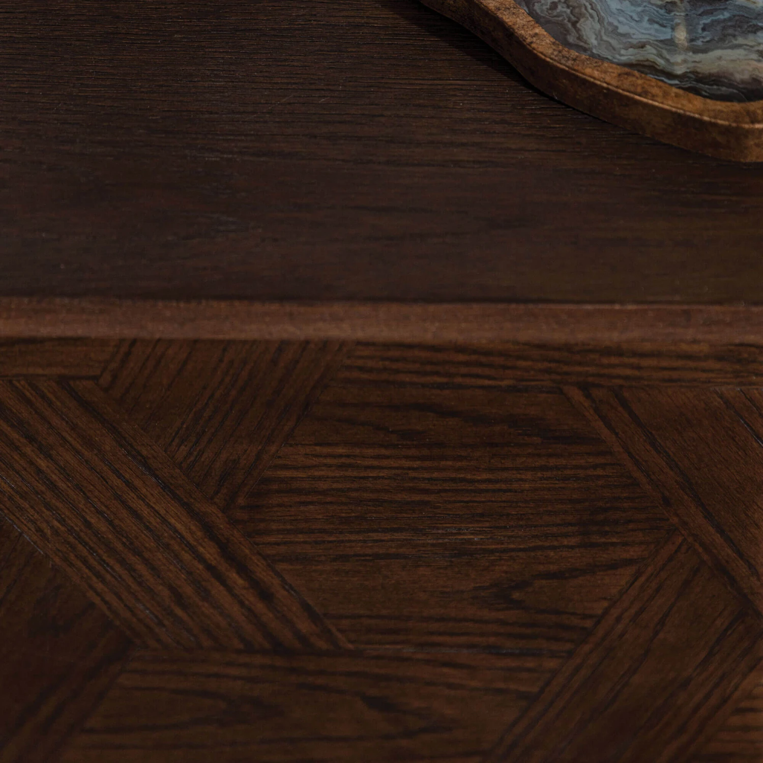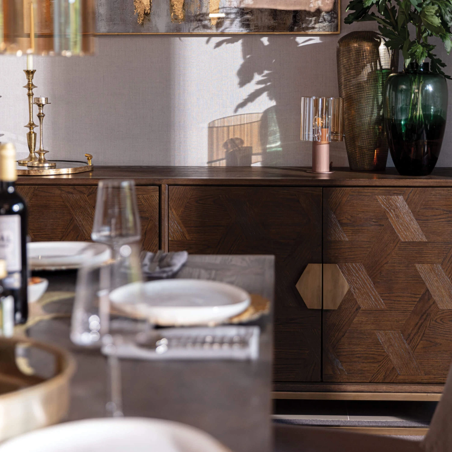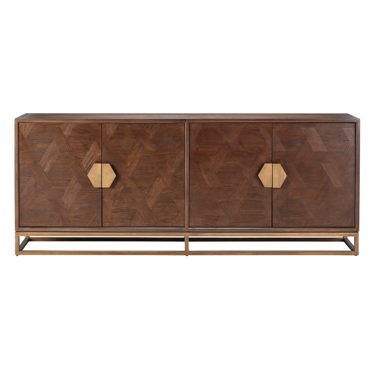 Accompanied with the open structure of the framework style base with a matte gold finish and hexagonal shape of the gold accent handles, which echoes the geometric motif in the parquetry, the Hemingway is a large, spacious sideboard that is sure to elevate the look of any modern or more classically styled interior, with its dynamic yet sumptuous design that just beckons to be seen.
