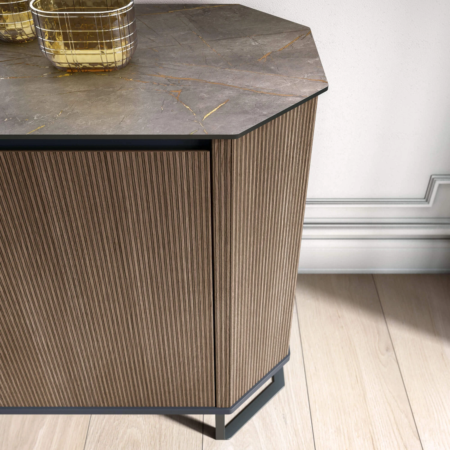 Channelling a modern influence, the 3 door sideboard boasts clean lines and a rectangular silhouette for a touch of contemporary flair. The unit’s hexagon edges are mirrored on the base to create a firm foundation that provides the unit with stability whilst complimenting the dark brown ribbed wood, which resembles a honey dipper. On the top of the unit is a laminate coating with a wonderful marble effect which displays elements of gold, giving the unit and your spaces a modern and luxurious feel.