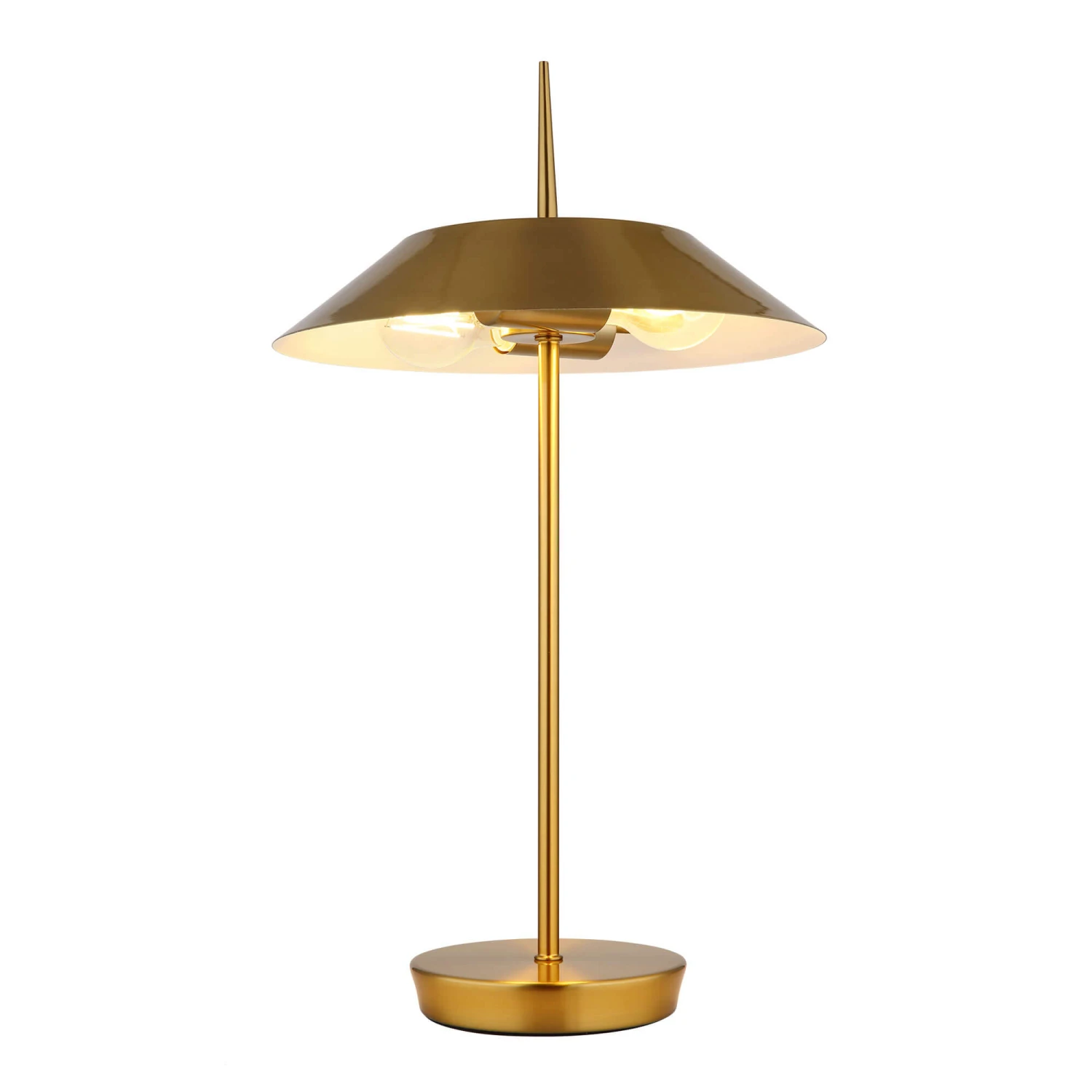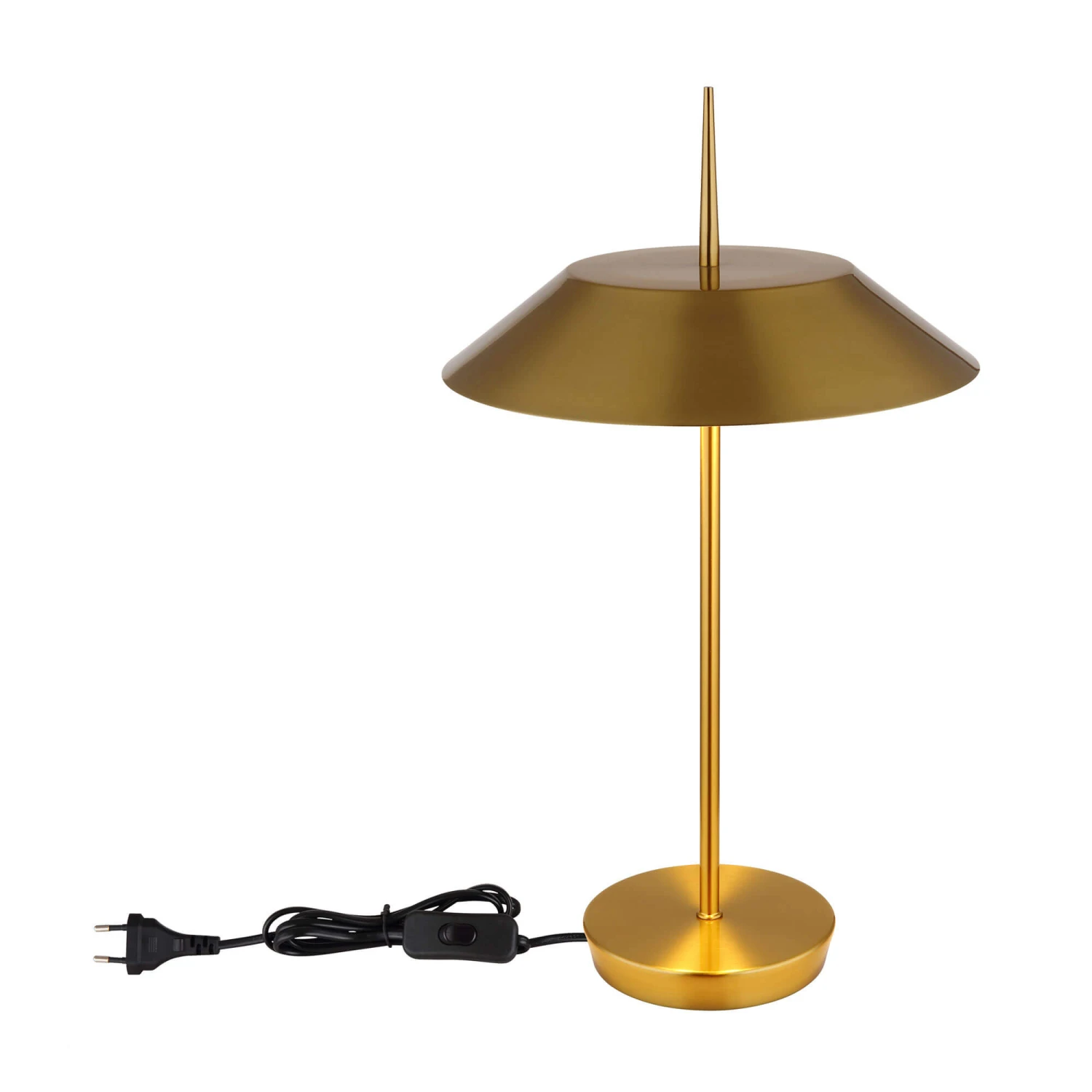 Add a modern and eye-catching touch to your home with this Pike Matt Brass Table Lamp. Illuminable by two E27 LED bulbs, this chic table lamp is made from metal and features a flat umbrella shaped shade with a round base in an elegant matt brass colour, ensuring an even distribution of light while creating a pleasant atmosphere. Operated by a convenient rocker switch, it is easy to use and fitted with a UK plug adaptor. Functional yet decorative, this stunning table lamp is perfect for adding a stylish and decorative element to any room, making it ideal placed on a desk, bedside table or sideboard.