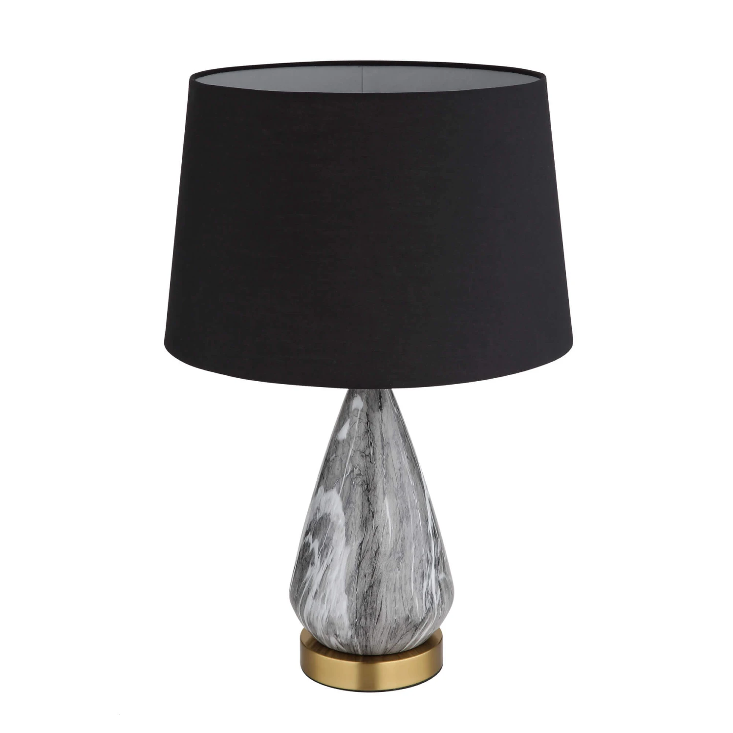 Luxuriously enhance your home with this Pisa Grey Marbled Table Lamp With Black Shade. Illuminable by an E27 LED bulb, this elegant table lamp features a black textile cylinder shade, a grey marble teardrop shaped body and a round brass metal base, creating a warm and cosy atmosphere. Operated by a convenient rocker switch, it is easy to use and fitted with a UK plug adaptor. Modern and unique in design, this stylish table lamp is perfect for adding a touch of sophistication to any room, making it ideal placed in your bedroom or living room.