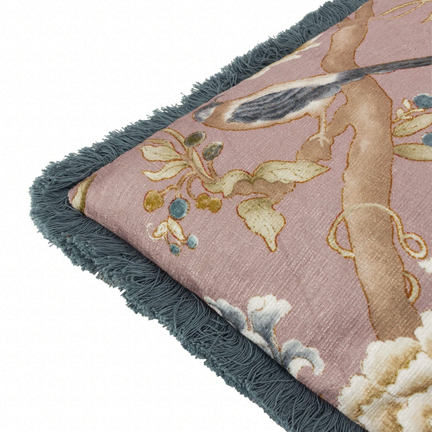 Introduce an dramatically gorgeous touch of nature to your living space with the Porcelain Garden Blush Pink Chenille Cushion. Crafted from 100% polyester, this beautiful cushion features a delicate printed peony blossoms and birds design drawing inspiration from early 19th century hand-painted Chinese wallpaper in soft watercolours and pastels on a luxurious, muted blush pink chenille fabric, creating an inviting yet sophisticated look. Complete with a blue fringed trim, this eye-catching cushion has a zip closure and will create a statement in any room with its decorative and practical design, making it perfect for adding a serene and floral charm to any traditional or modern interior.