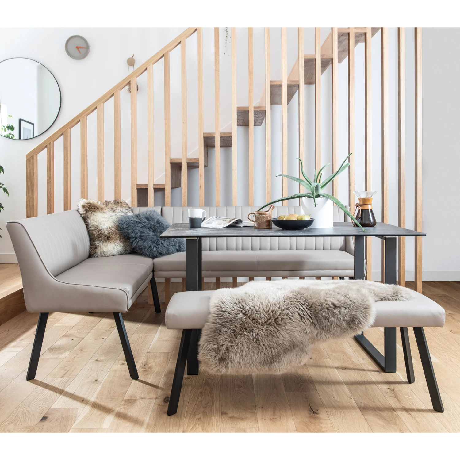 The epitome of industrial chic design, the Porto Taupe Right-Hand Corner Dining Bench is unapologetically modern with its sleek, stylish aesthetic. Upholstered in a smooth, taupe coloured faux leather fabric with ridge stitch detailing along the backrest adding texture and depth, the Porto is sure to fit seamlessly into any contemporary setting with its neutral hue and elegantly simplistic look. Accompanied with its angled matte black coated metal legs, the Porto Corner Dining Bench is bound to enrich any modern décor with its attractive urban flair.