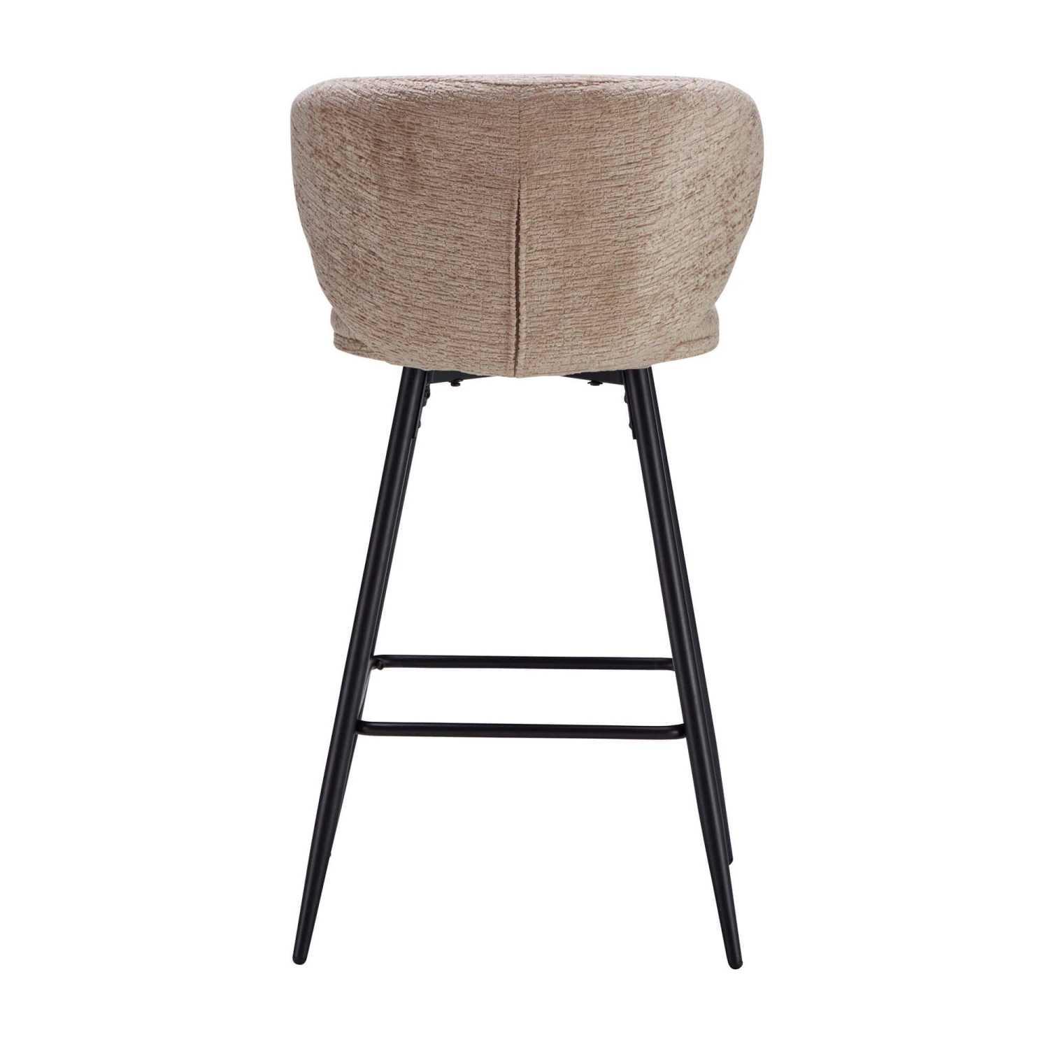 A distinctly shaped bar stool with a curved backrest that cradles you within its wrap around armrests. The disk-shaped seat matches the chairs beige fabric upholstery and provides you with a cushioned seat for prolonged sitting. With complimenting black feet that slightly taper near and rounded feet, it prevents scratches on your floor and provides you with a solid base.