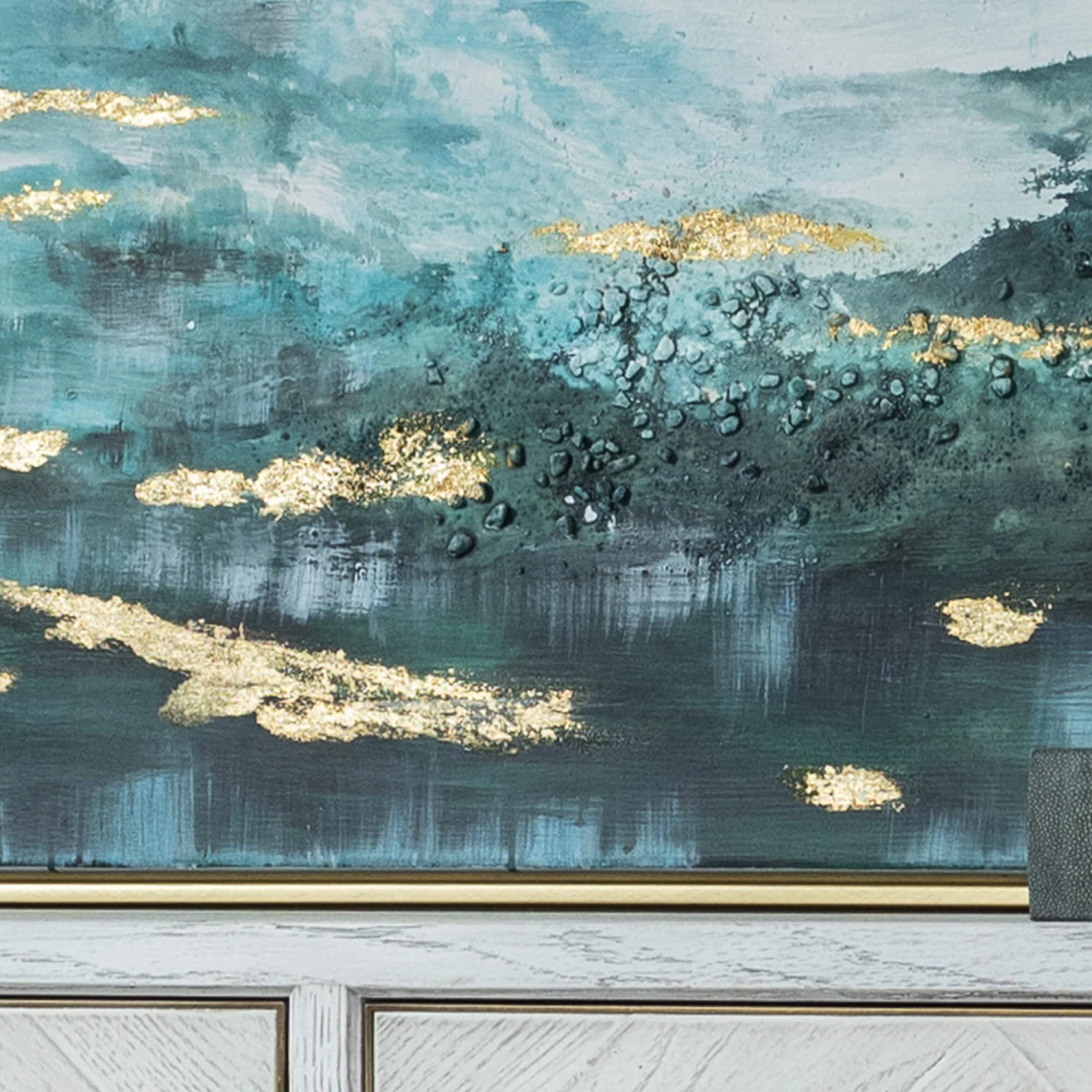 A textured canvas that features an overcast mountain environment with distant valley fog that is nestled amongst the mountains crafted from a blend of dramatic blues and greens that blend with pale white and shimmering gold.