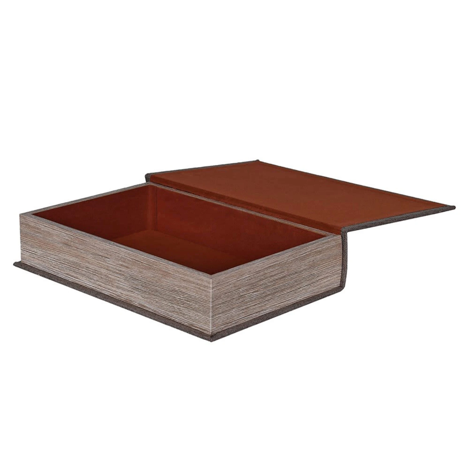 A pair of book boxes in a large and medium size, finished in a grey linen. On the inside of the book is a soft orange velvet finish, ideal for keeping valuables safe. On the outside, the box mimics a dense novel with layered pages and a grey linen finish.