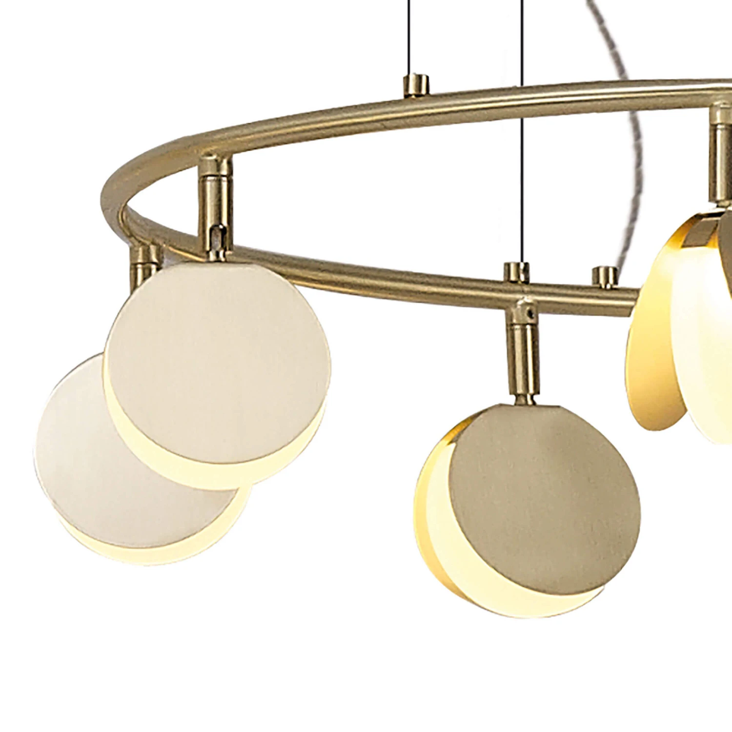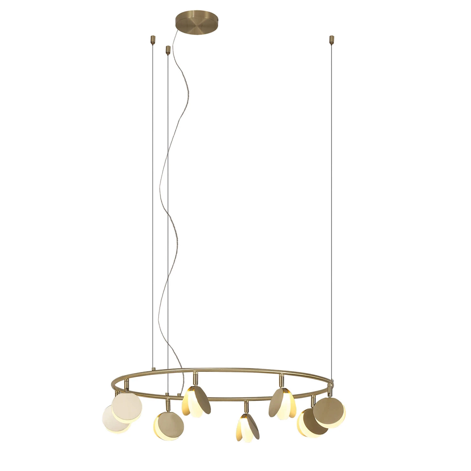 The stunning Shell Gold 8 Light Pendant features beautiful gold round framework that adds a touch of elegance and glamour to any space. Each light is situated in round disks allowing you to adjust the direction of the lights, making them appear like stage lights. The integral LED lights provide bright and energy efficient illumination, emitting a cosy warm white light and adding an inviting atmosphere. With an adjustable height at the point of installation from a minimum height of 30cm to a maximum height of 200cm, this pendant light is sure to make a statement in any preferred room.