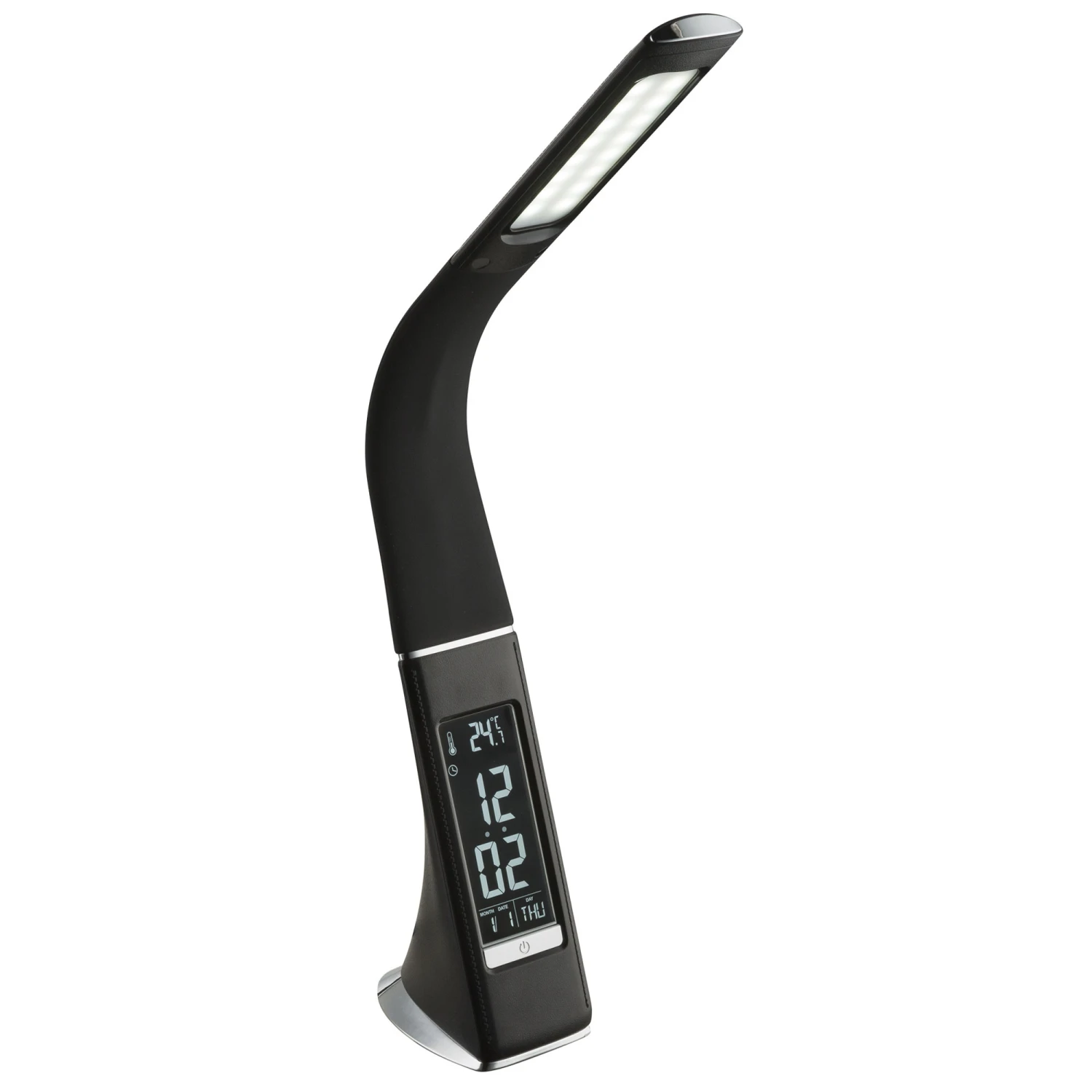 Illuminate your work space with this modern, Sophie Black Leather Executive Desk Light. Contemporary design meets functionality, meaning you can burn the candle at both ends. The LED fitting provides 35,000 hours of light – perfect for night owls – as well as a digital alarm clock built in the base, which meets the sleek, elongated neck for a stylish finish. Made of chromed metal and black plastic, in addition to the possibility of adjusting the light colour of the flexible lamp arm, the Sophie black desk lamp also offers the time, a calendar and room temperature.