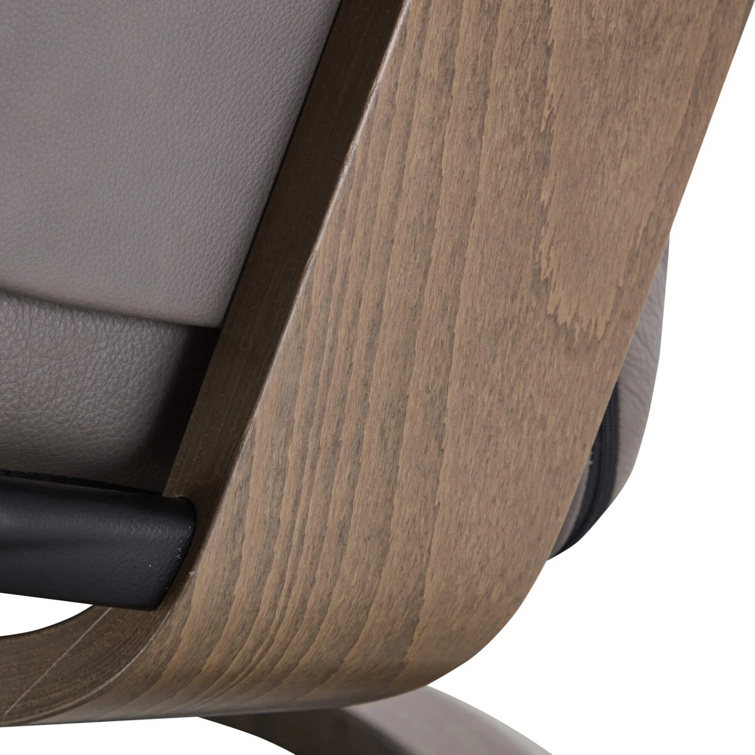 A chair synonymous with the Stressless brand, the Mayfair Large Recliner Chair & Stool is a classic, quintessential Stressless design, with its iconic elegant styling and revolutionary, comfort providing technology. Featuring extra supple cushioning and the Plus™, BalanceAdapt™ and Glide™ systems, which deliver an effortless recline and provide maximum support and comfort for your neck and lumbar region by responding to your body’s slightest movement; the Mayfair is supremely comfortable and adaptable to your personal, optimum level of comfort. The signature base in smoked oak with stylish matt black spokes lends this chair and stool a timeless aesthetic, whilst the smooth Velaro leather in a neutral grey tone offers practicality and compliments the blend of textural wood grain and the metallic surfaces of the base beautifully.