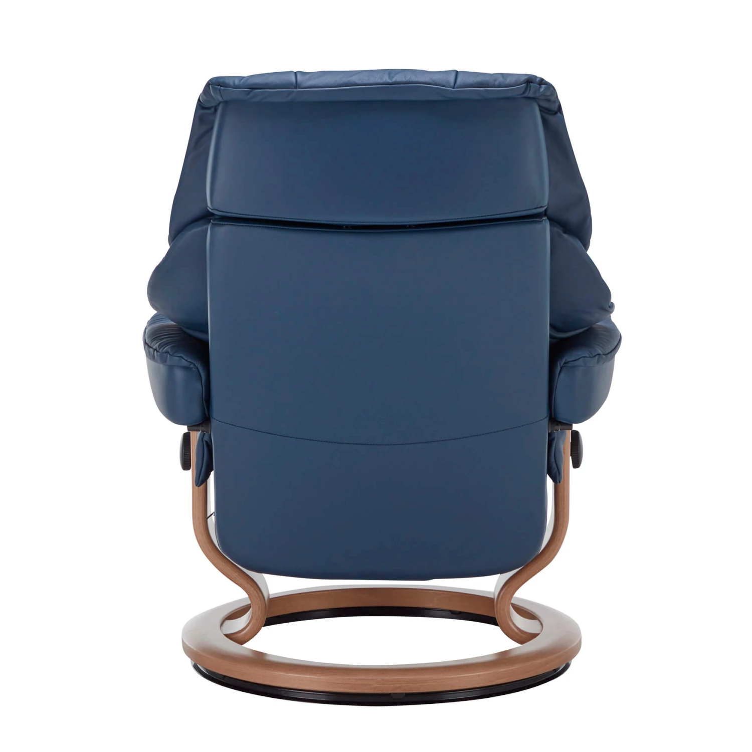 A true paragon of what a recliner should be, the Reno Paloma Oxford Blue Medium Leather Recliner Chair & Stool delivers the revolutionary comfort and support that Stressless designs’ are renowned for, in an innovative, personally adaptable design. Featuring a height adjustable headrest, supple cushioning and over-pads filled with a sumptuously soft foam, the Reno offers unrivalled comfort and support and has the added benefit of being adjustable to your optimum level of comfort. This model is upholstered in ‘Paloma Oxford Blue’ leather with a Classic Oak Base.